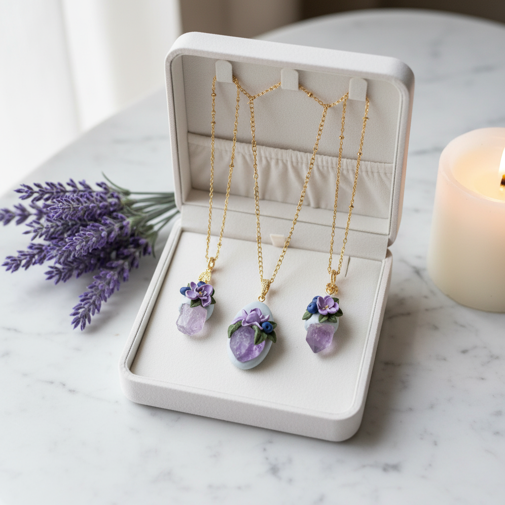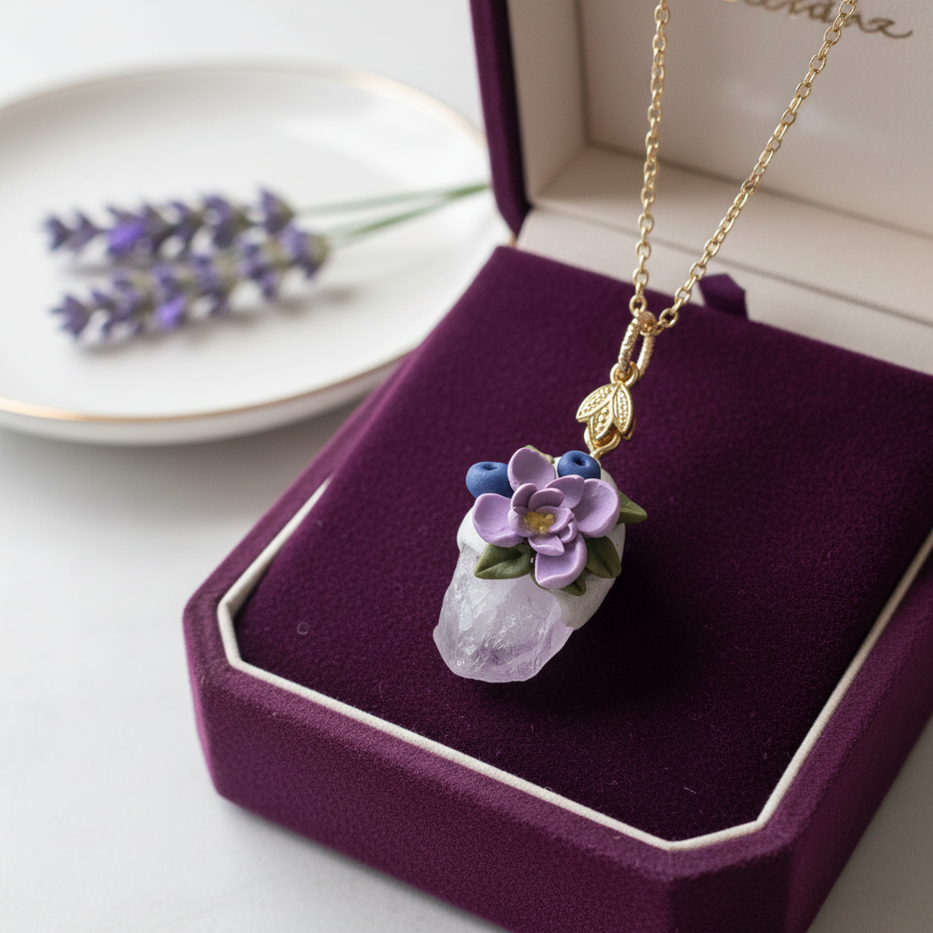 Šie amuleti ir veidoti no dabīga ametista kristāla, ko papildina smalks, ar rokām veidots polimērmāla ziedu ietvars. Katrs zieds tiek veidots individuāli, tāpēc nav divu pilnīgi vienādu rotu – katram amuletam ir savs raksturs un noskaņa.