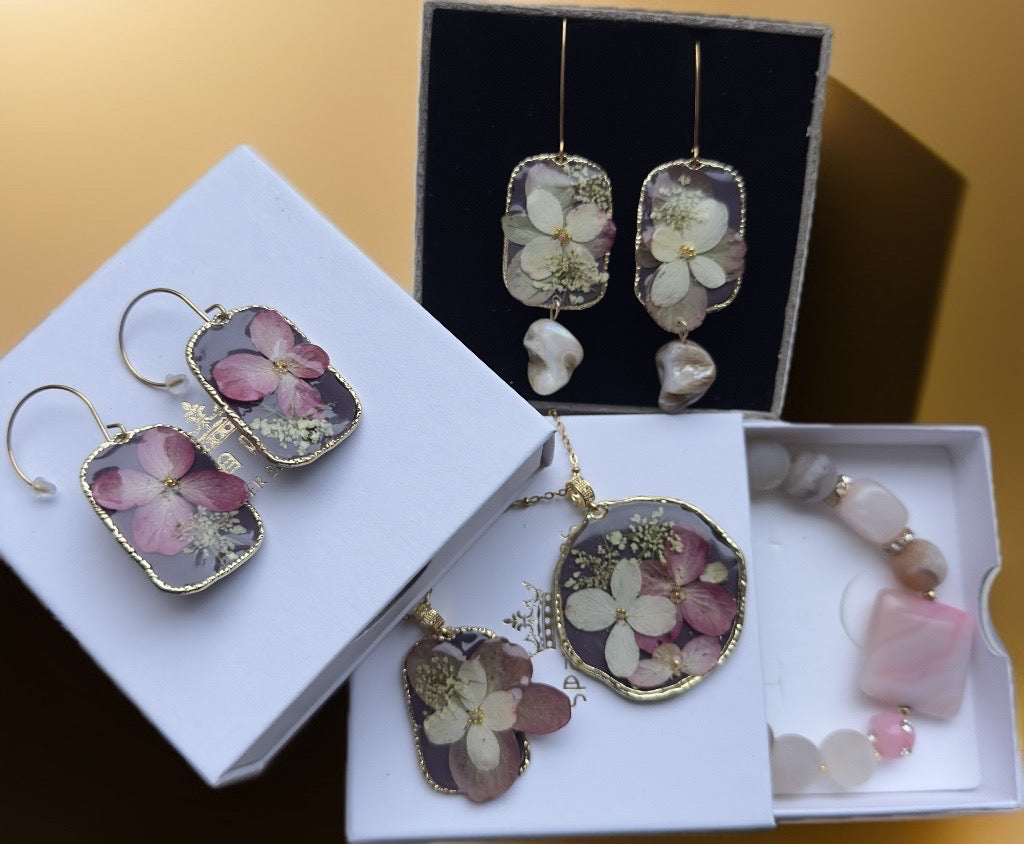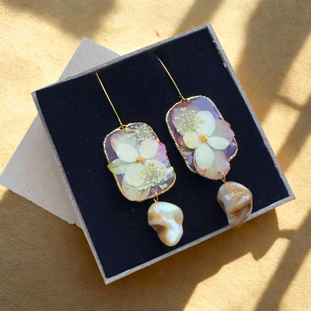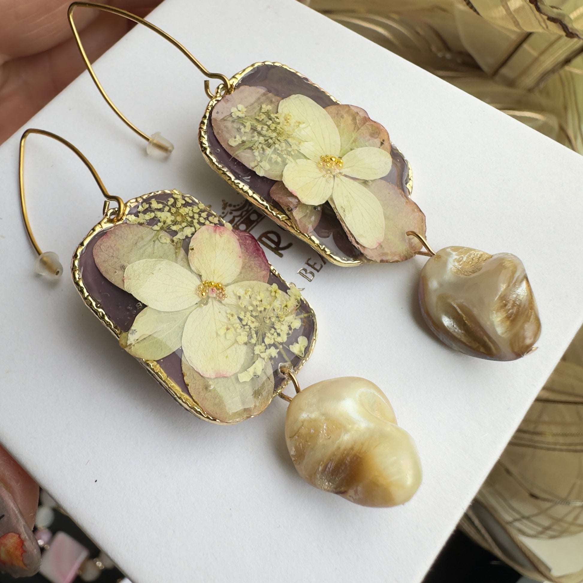Auskari izgatavoti no hortenziju ziediņiem, ietvars zelta krāsas misiņš, aizdara no nerūsējošā tērauda.