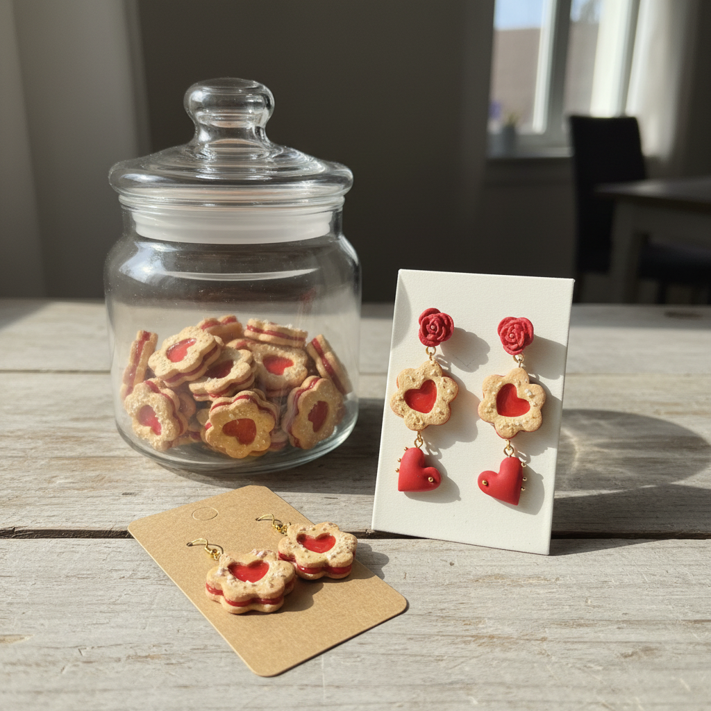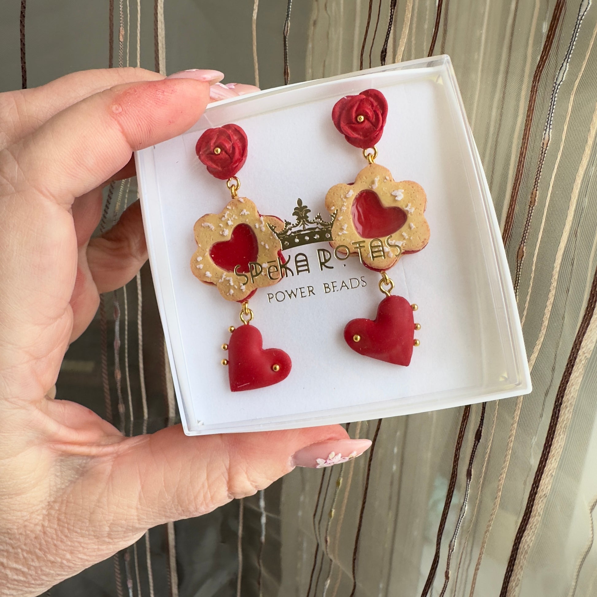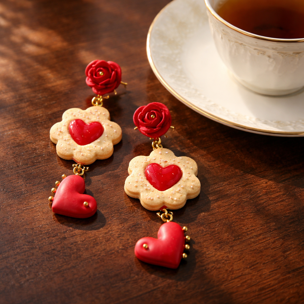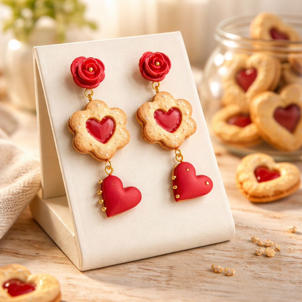Šie auskari ir rotaļīgs un sirsnīgs stāsts par mīlestību — kā silts, svaigi cepts cepums ar saldu pildījumu pašā vidū. Smilškrāsas cepuma forma ar pūdercukura efektu apvienota ar koši sarkanu sirsniņu, kas piešķir rotai svētku noskaņu un vieglu humora pieskārienu.