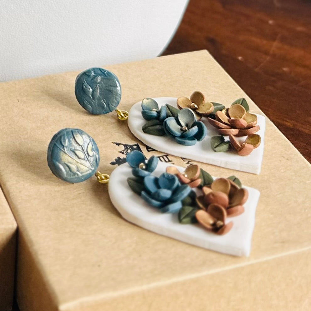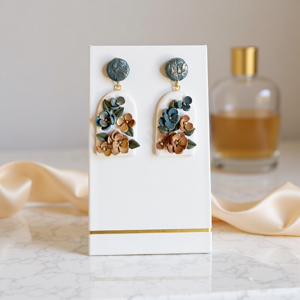 Eleganti, rokām veidoti auskari uz balta pamata ar smalkiem polimērmāla ziediem brūnā, olīvzaļā un zeltainos toņos. Krāsu kombinācija ir maiga un izsmalcināta, radot siltu, sievišķīgu noskaņu.