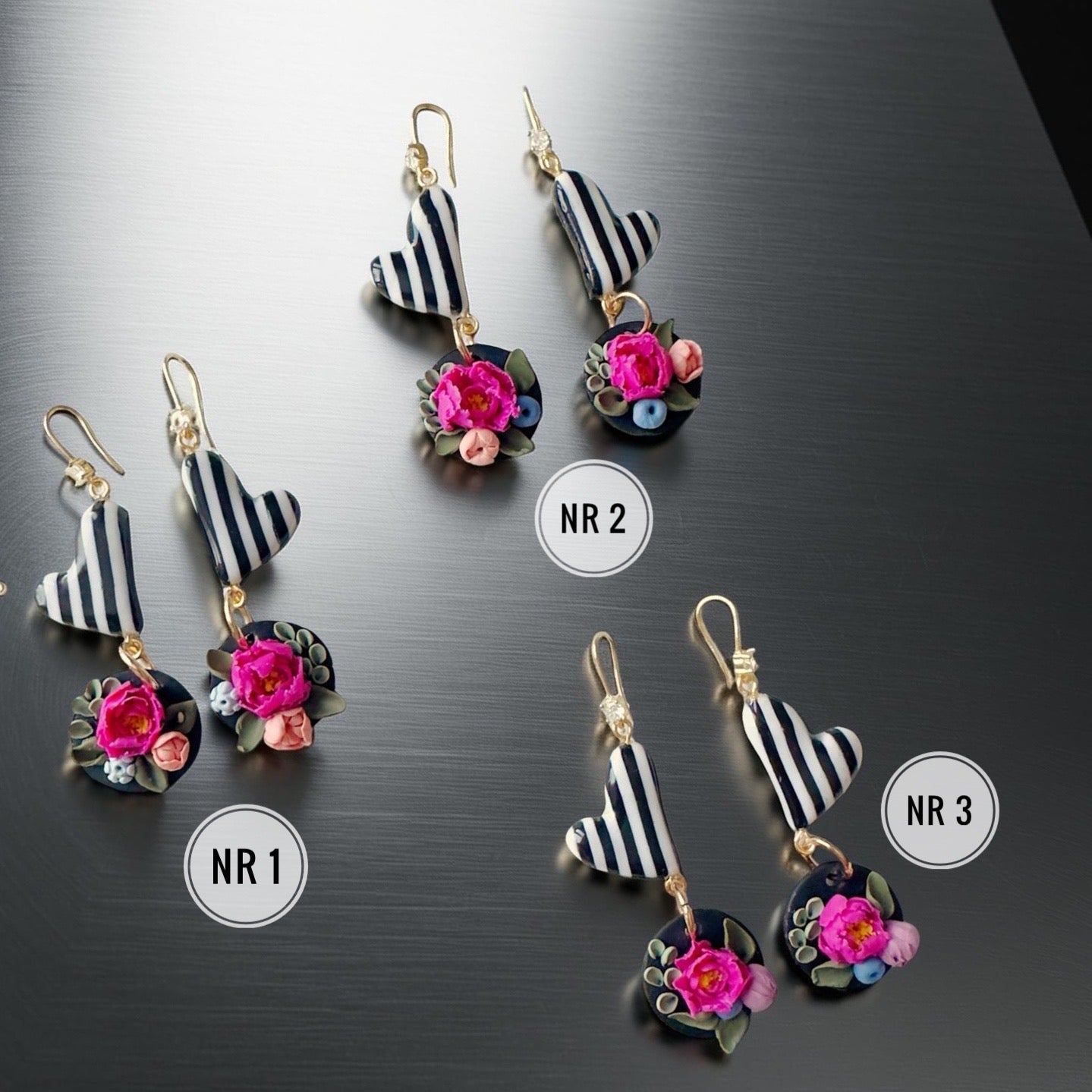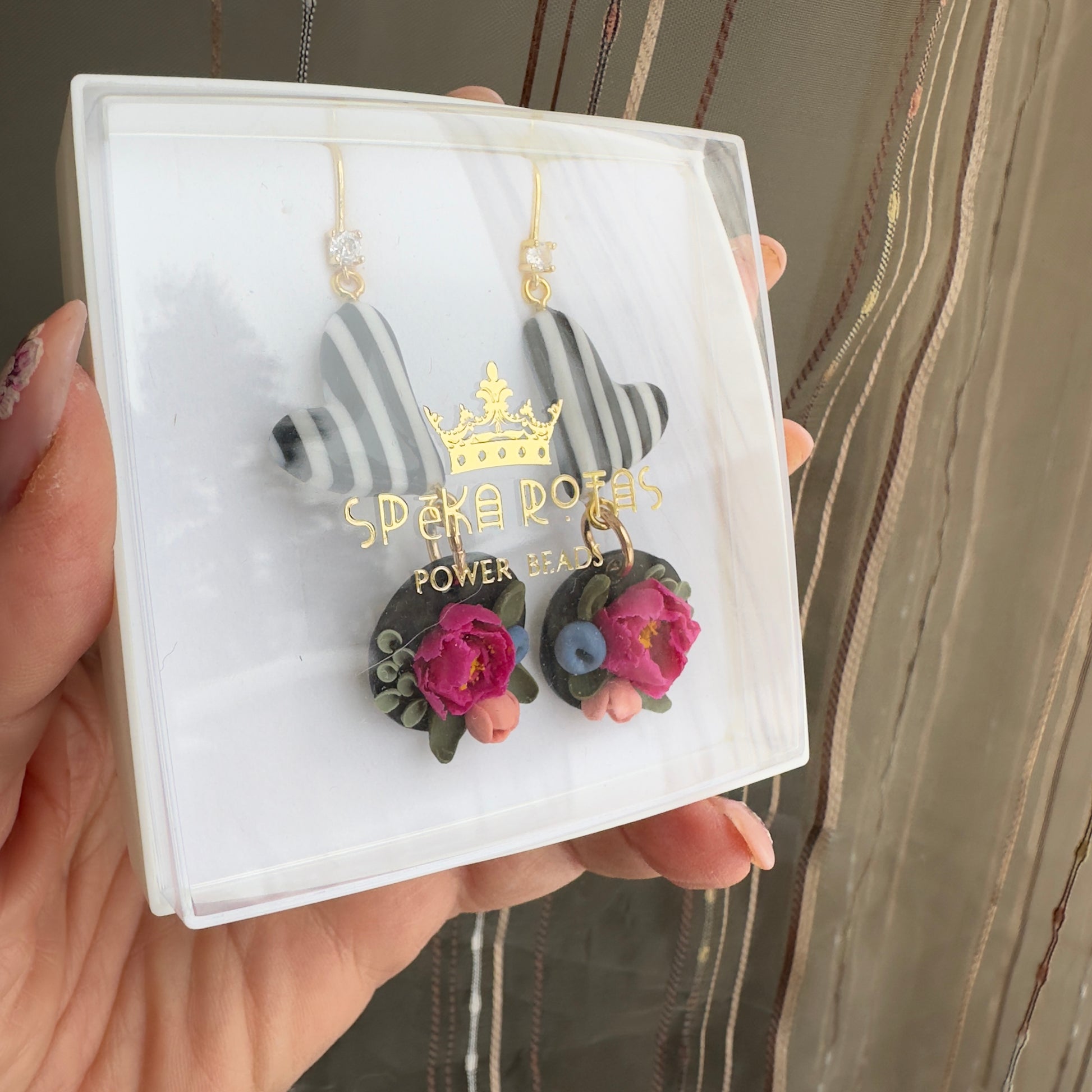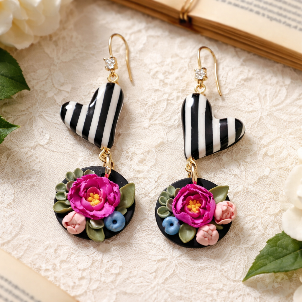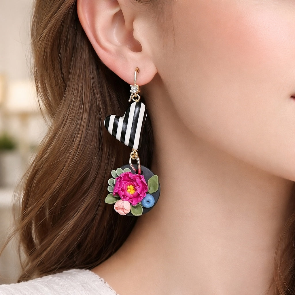 Stilizēti pojeņu ziedi uz melna fona, kam pievienota melnbalta strīpaina sirsniņa ar spīdīgu epoksīda glazūru veidojot marmora efektu. Katra detaļa ir rūpīgs roku darbs – polimērmasa veidota kā smalka miniskulptūra, tāpēc katrs pāris ir nedaudz unikāls. Auskari ir viegli, ērti un piemēroti ikdienai, svētku vakariem vai dāvanai sievietei, kura mīl ziedu rotas un smalku estētiku.