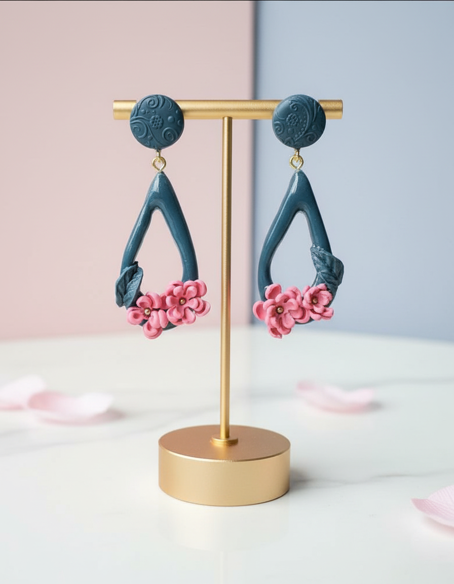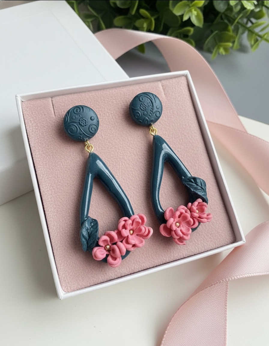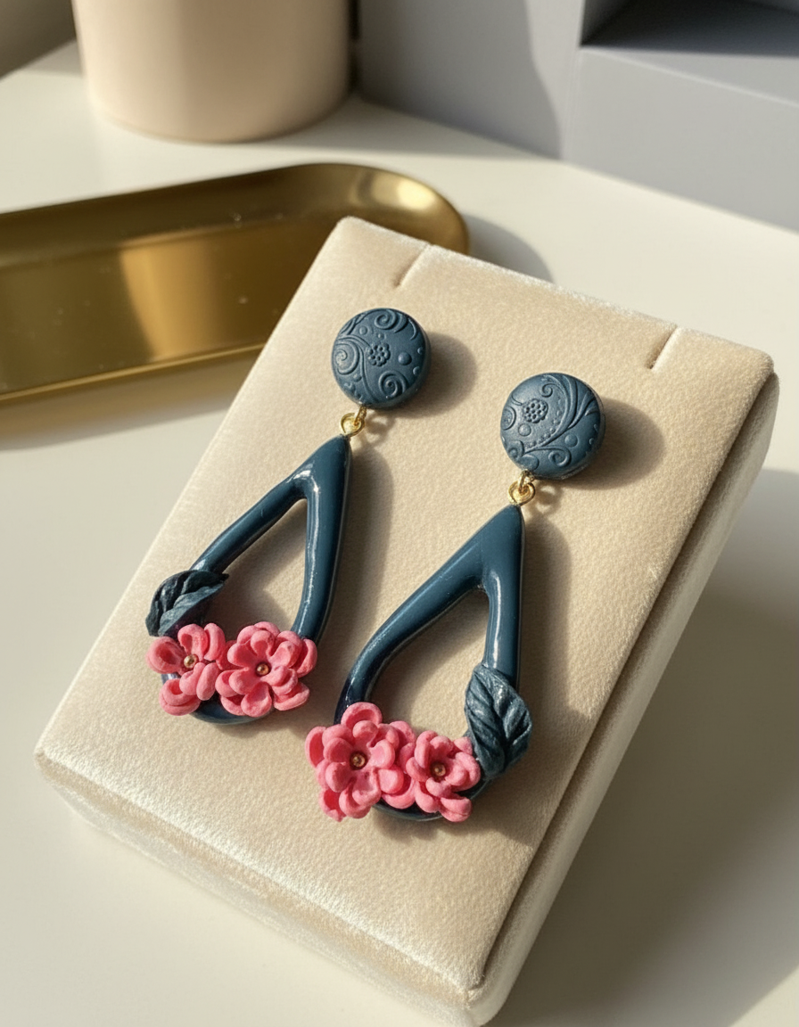 Katra auskara apakšdaļu rotā rūpīgi veidoti rozā ziedi ar zeltainiem centriem, kas rada spilgtu, sievišķīgu kontrastu.