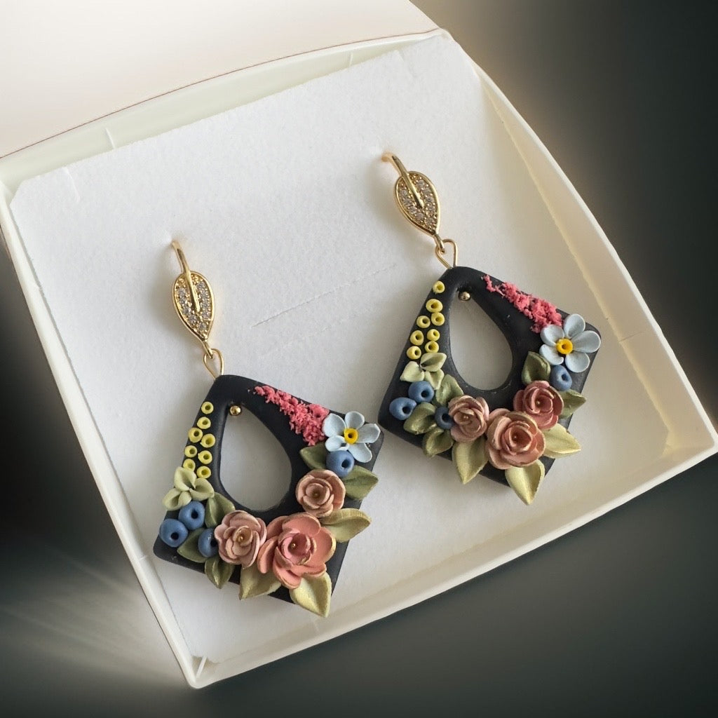 Unikāli ziedu auskari, iedvesmojoties no mākslinieces Reičelas Roišas. Roku darbs no polimērmāla uz eleganta melna fona – ideāla dāvana mākslas cienītājai