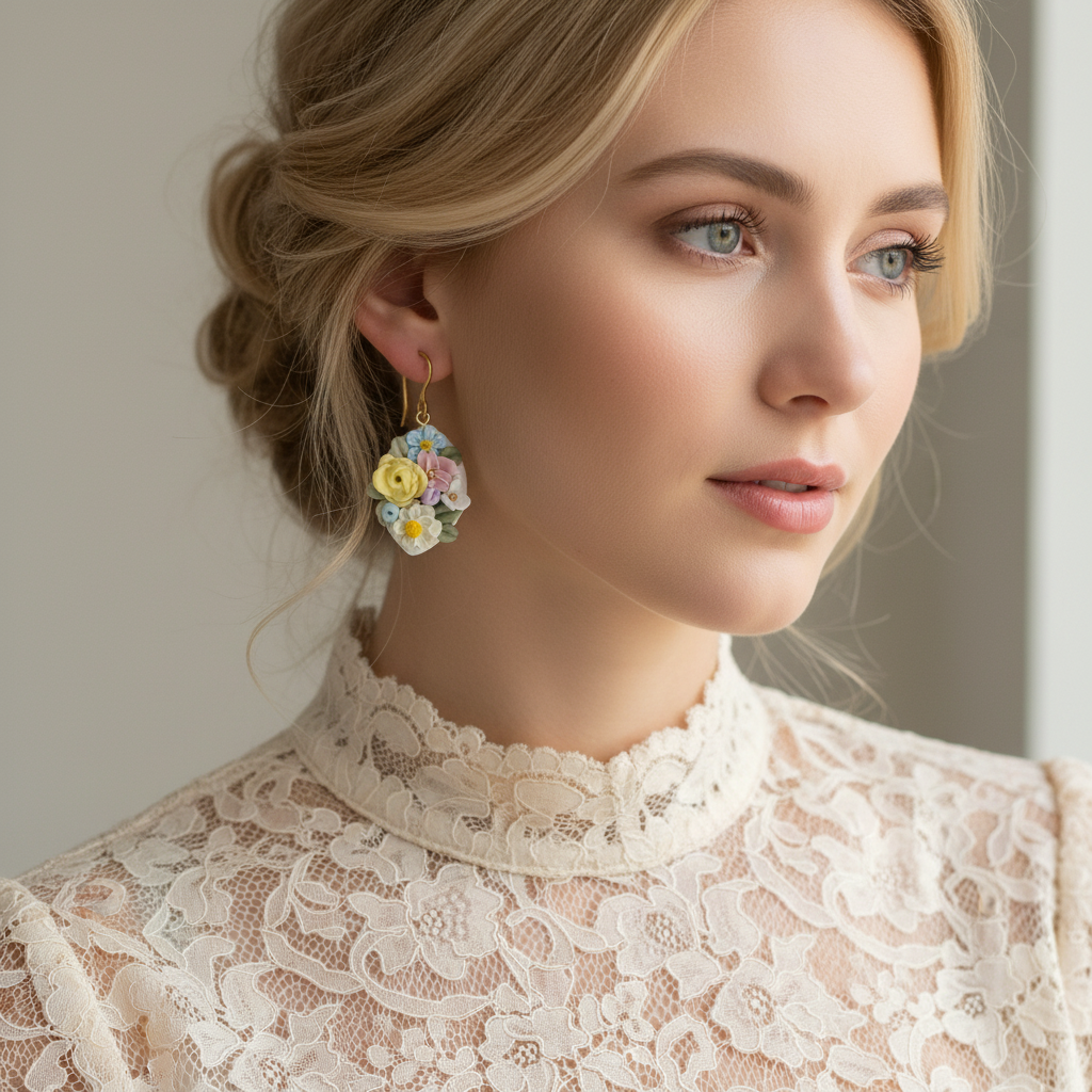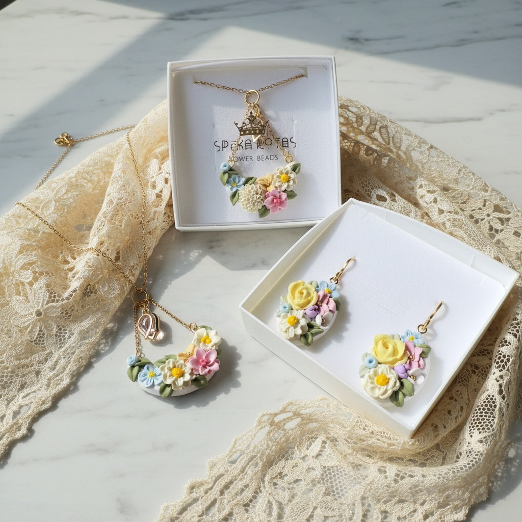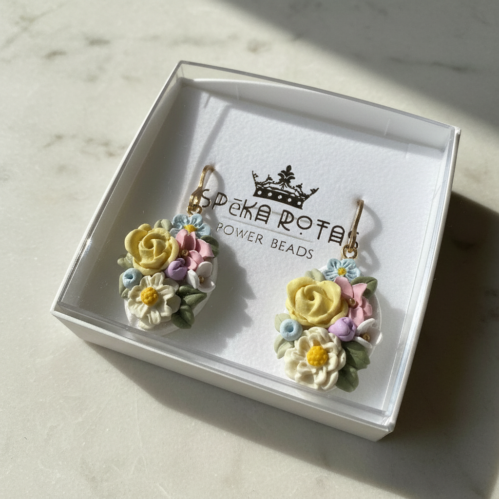 Pasteļziedi uz balta fona ir maiga un gaisīga rota, kas piešķir siltumu un svētku sajūtu. Katra detaļa ir rūpīgs roku darbs – polimērmasa veidota kā smalka miniskulptūra, tāpēc katrs pāris ir nedaudz unikāls. Auskari ir viegli, ērti un piemēroti ikdienai, svētku vakariem vai dāvanai sievietei, kura mīl ziedu rotas un smalku estētiku.