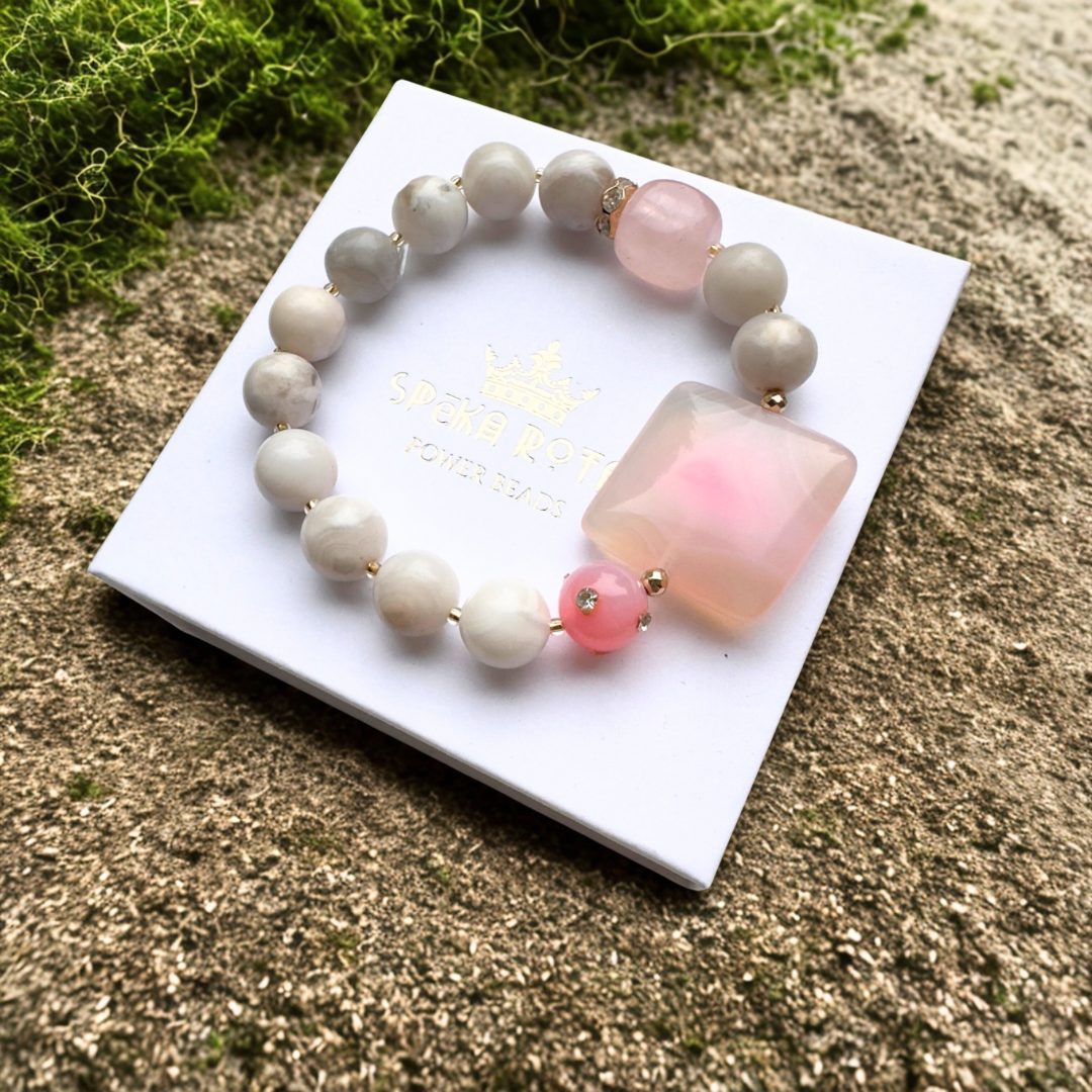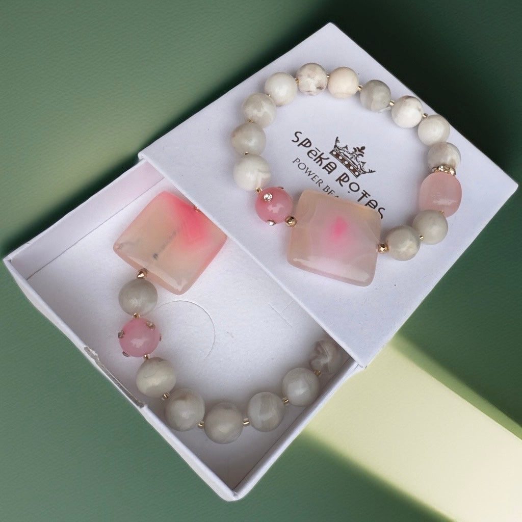 Šī aproce veidota no 10 mm apaļām ahāta bumbiņām. Kā akcents pievienots krāsots un nopulēts ahāta kvadrāts, krāsa izceļ akmens bagātīgo dzīslojumu un neietekmē tā maģiskās īpašības. Rotu papildina rozā kvarca kristāls – maiguma un sirds siltuma simbols un rozā ahāta bumbiņa ar iestrādātiem zirkonija kristāliem.