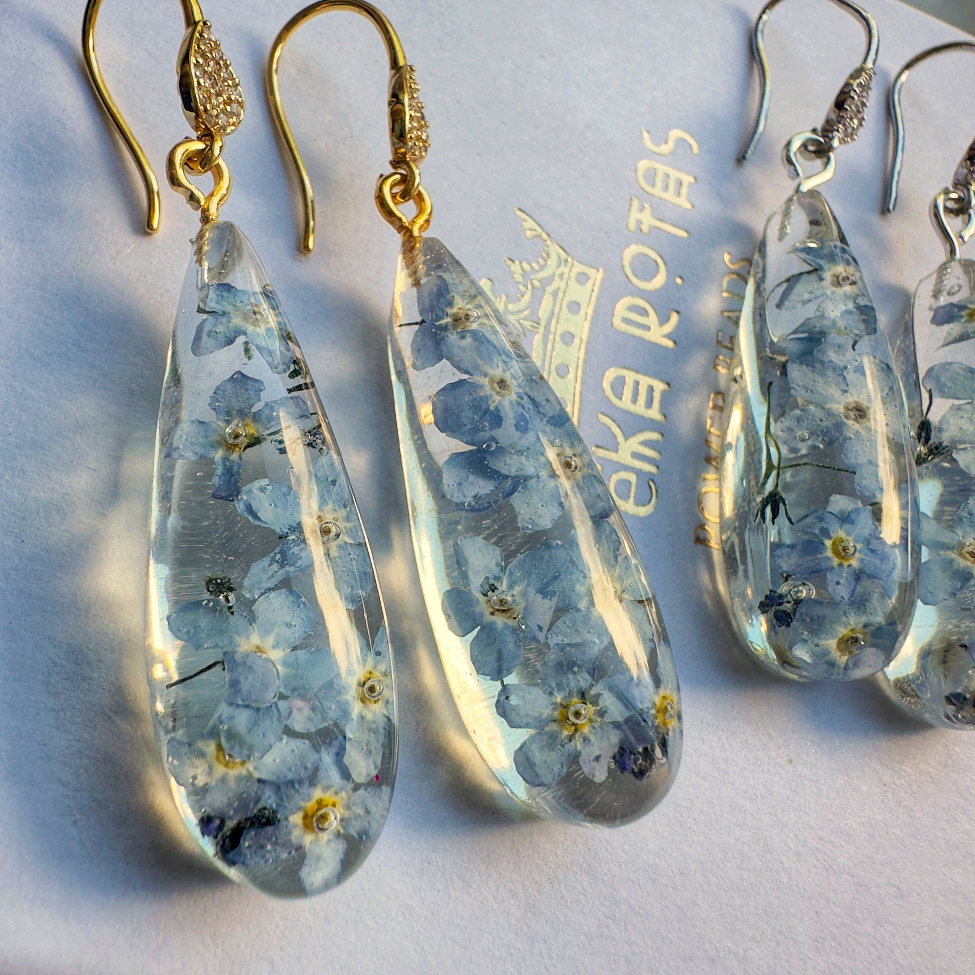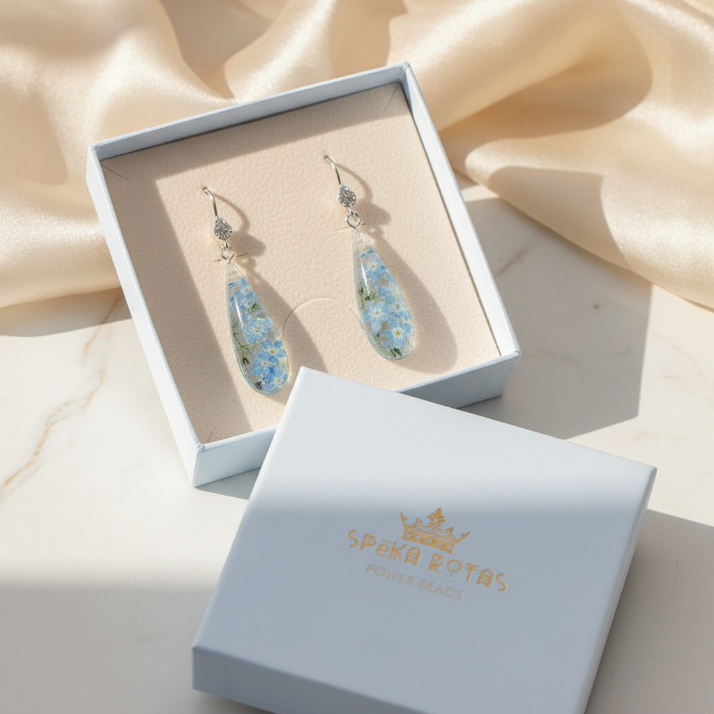 Auskari izgtavoti no epoksīta un kaltētiem augiem. Iesaiņots baltā kastītē, gatavs dāvināšanai.
