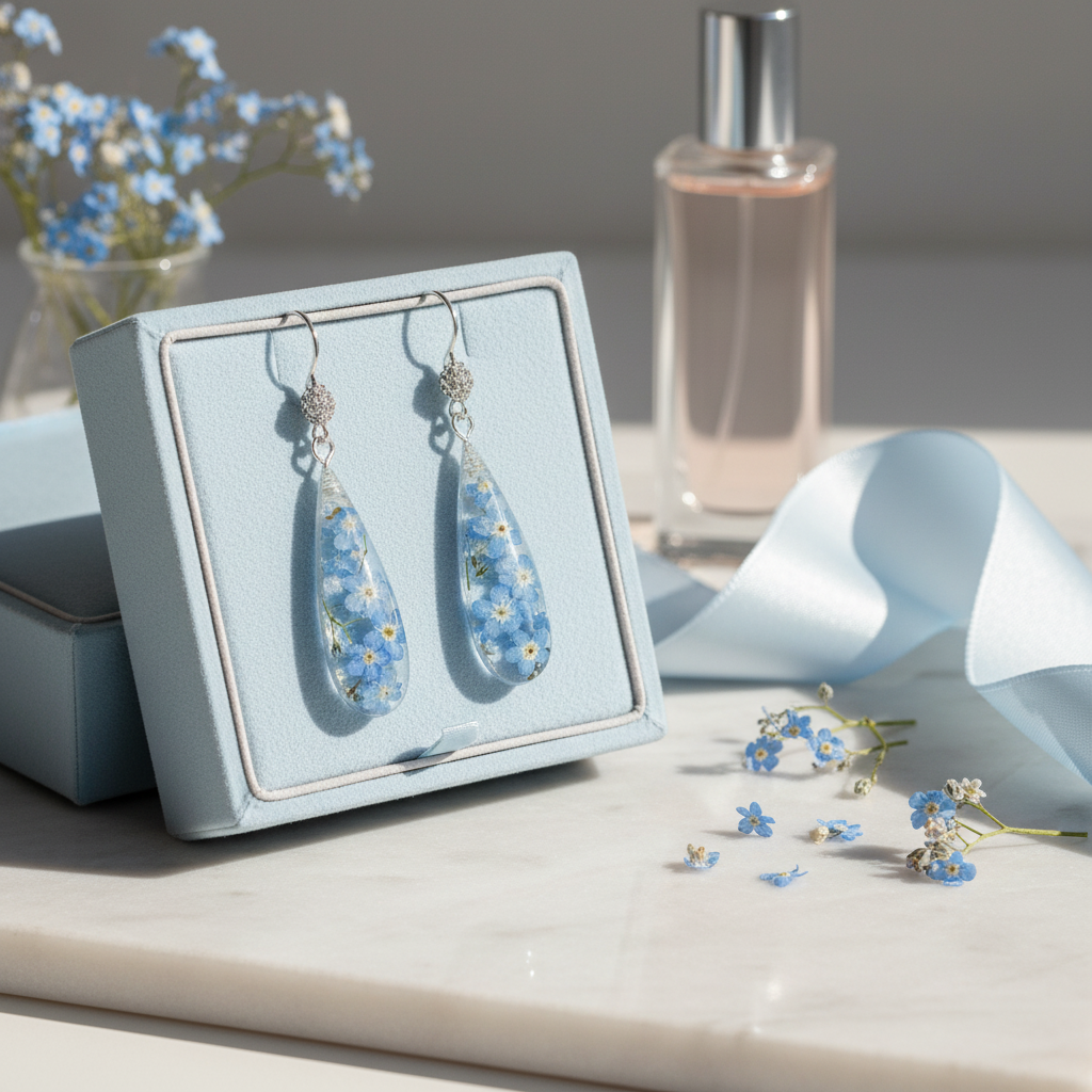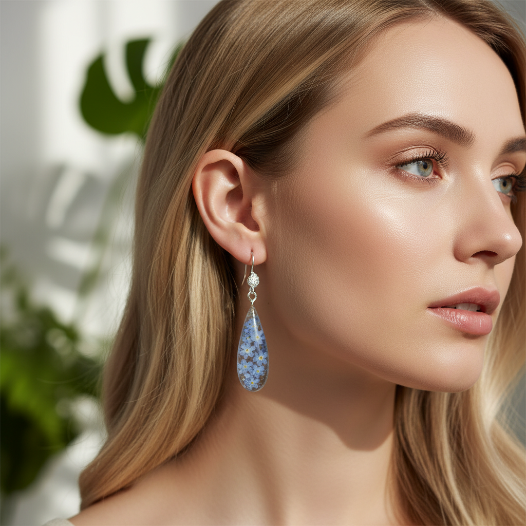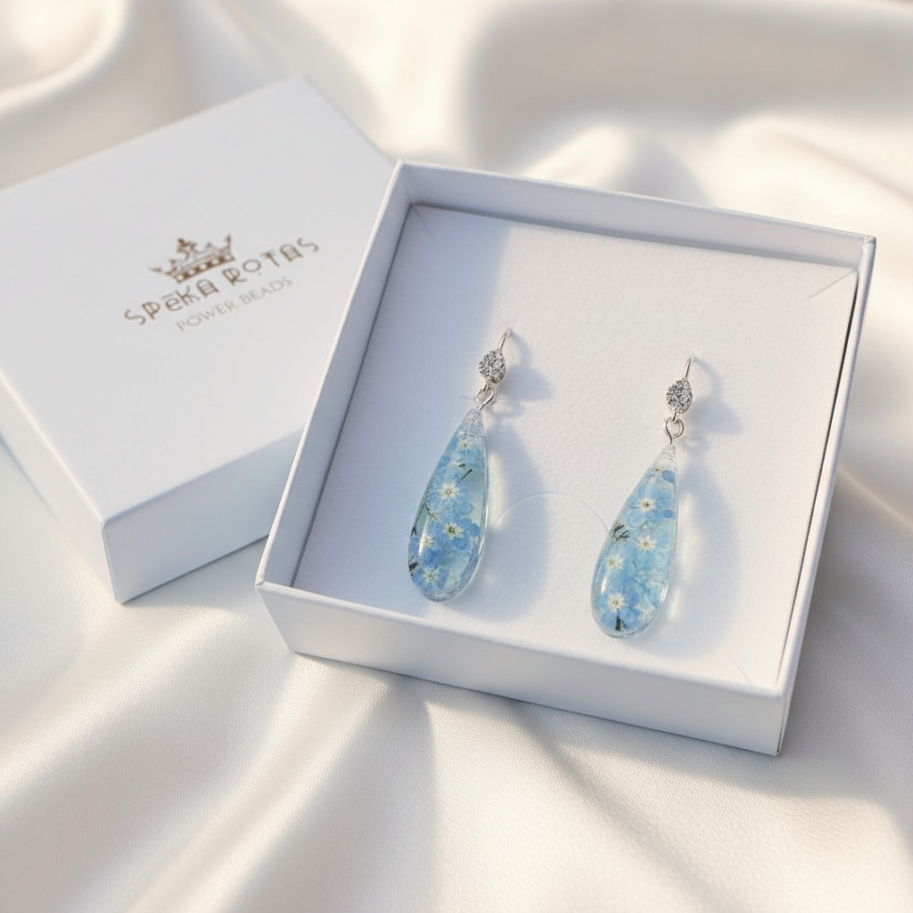 Piedāvājam maigi zilas neaizmirstulītes uz pelēki caurspīdīga fona, kas lieliski izceļ katru ziedlapiņu. Auskaru pussfēras forma kalpo kā palielināmais stikls, izceļot zieda nianses.