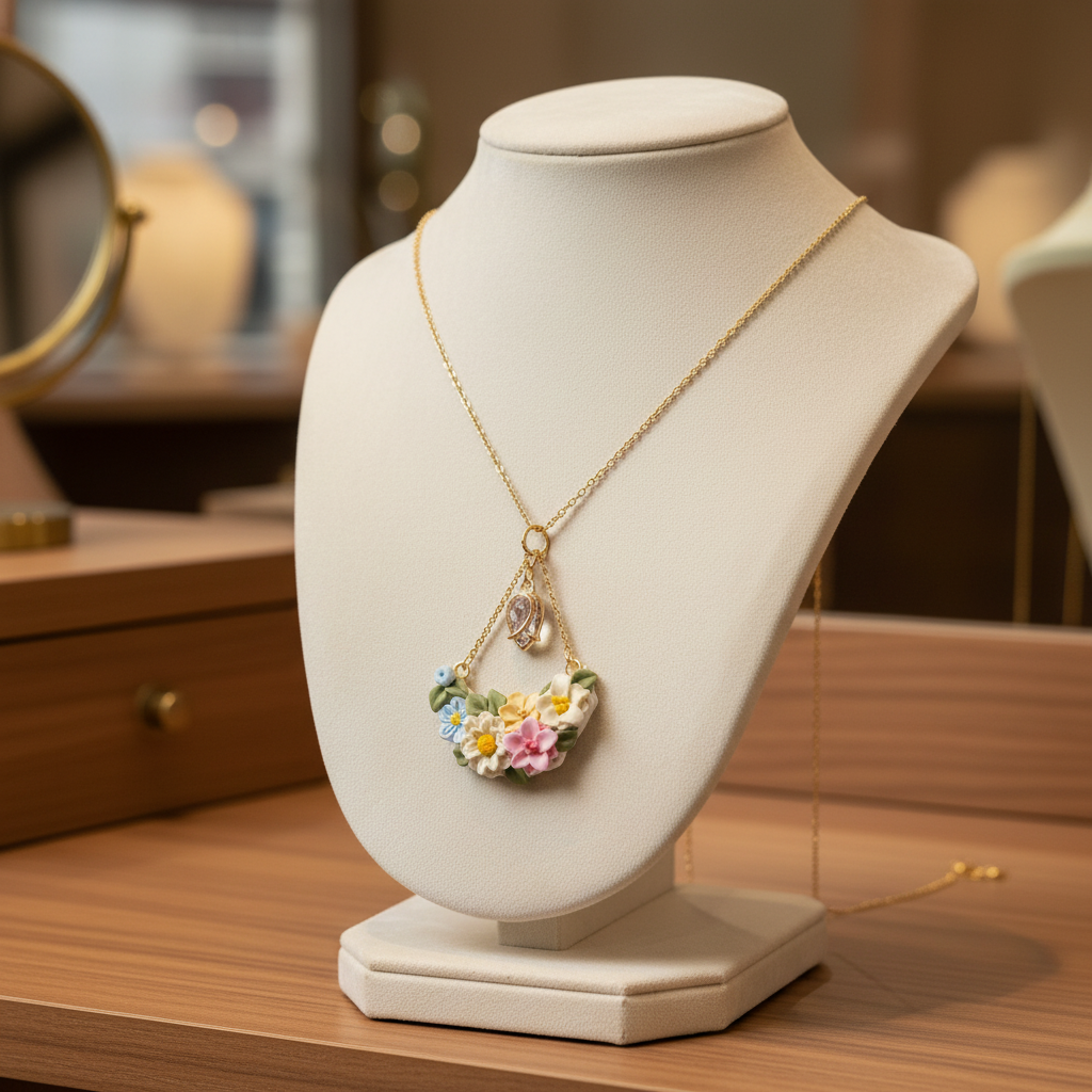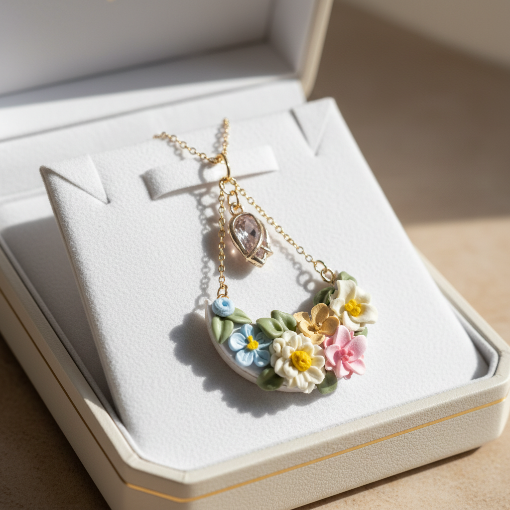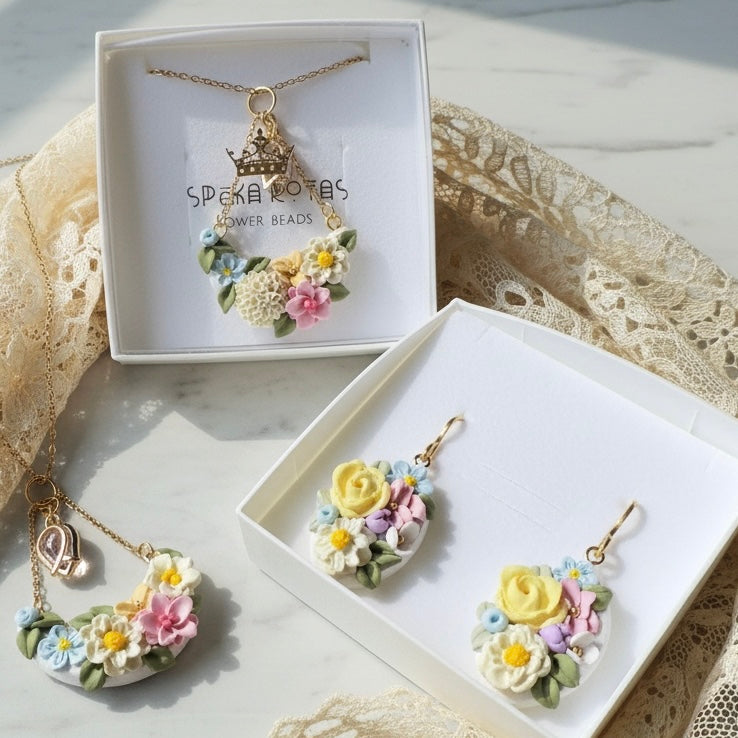 Pasteļziedi uz balta fona ir maiga un gaisīga rota, kas piešķir siltumu un svētku sajūtu. Ziedi izvietoti uz apgāzta mēness, simbolizējot laivu. Virs rotas ir iekarināts kristāliņš. Katra detaļa ir rūpīgs roku darbs – polimērmasa veidota kā smalka miniskulptūra, tāpēc katrs pāris ir nedaudz unikāls. Auskari ir viegli, ērti un piemēroti ikdienai, svētku vakariem vai dāvanai sievietei, kura mīl ziedu rotas un smalku estētiku.