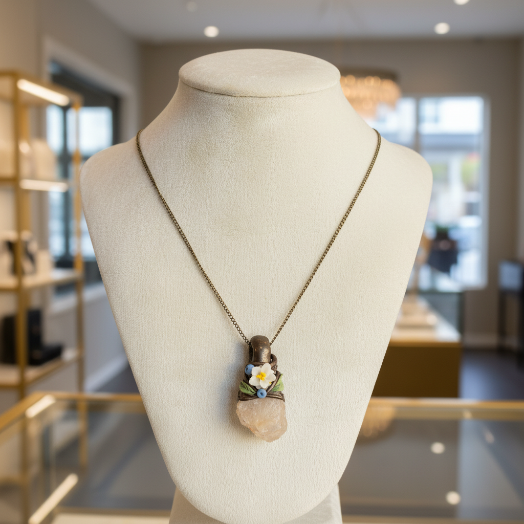 Šis amulets veidots ap dabīgu kalnu kristālu viegli bēšā tonī, ko ietver smalks, ar roku veidots polimērmāla ziedu ietvars. Ziedu detaļas veidotas kā miniatūras formas, kas piešķir rotai vieglumu, trauslumu un klusu vizuālu dziļumu. Katrs darbs ir unikāls — gan kristāla forma, gan ziedu izvietojums katrā amuletā nedaudz atšķiras.