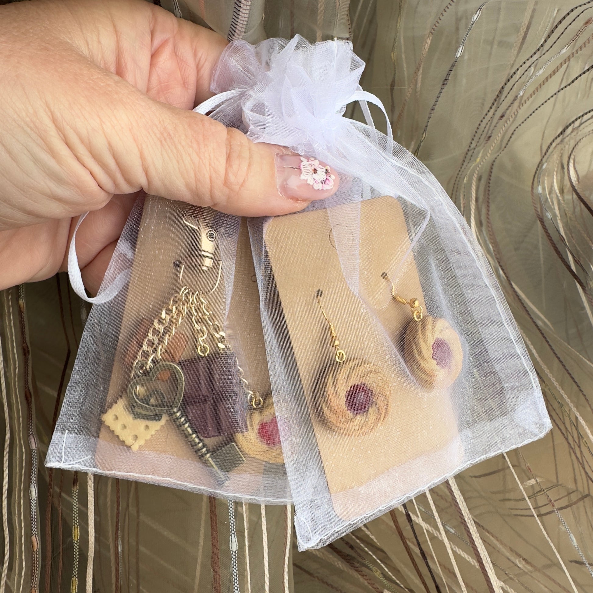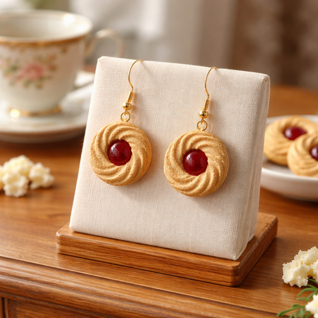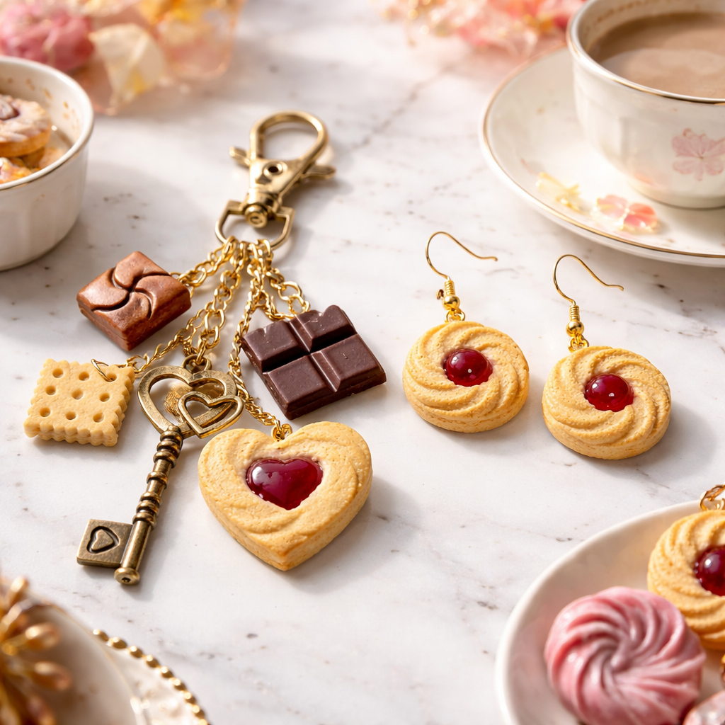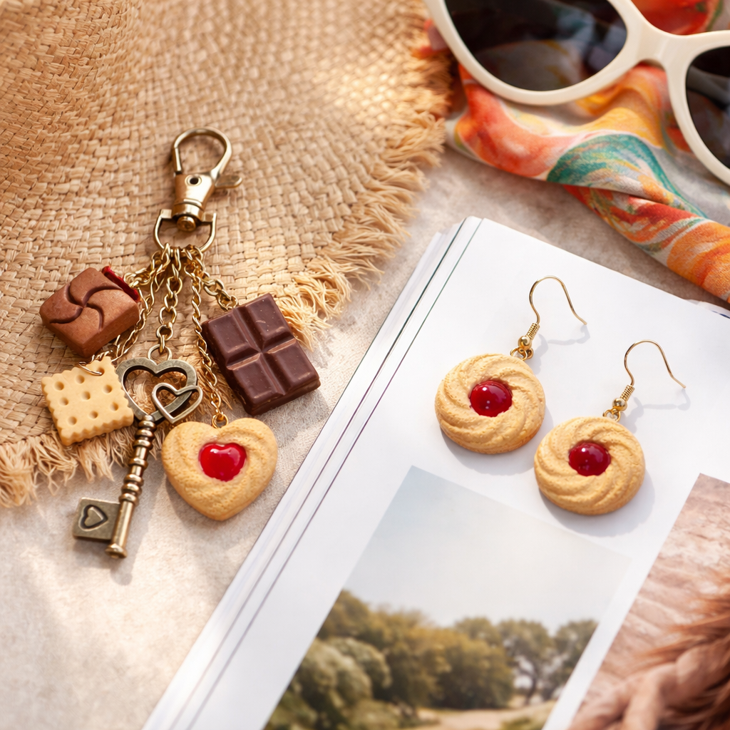Šie cepumu iedvesmotie aksesuāri ir mazs, rotaļīgs mīlestības žests – kā salds pārsteigums, kas vienmēr ir līdzi. Zeltaini “cepuma” toņi, smalka tekstūra un dažādu saldumu stilizācija vienā komplektā.