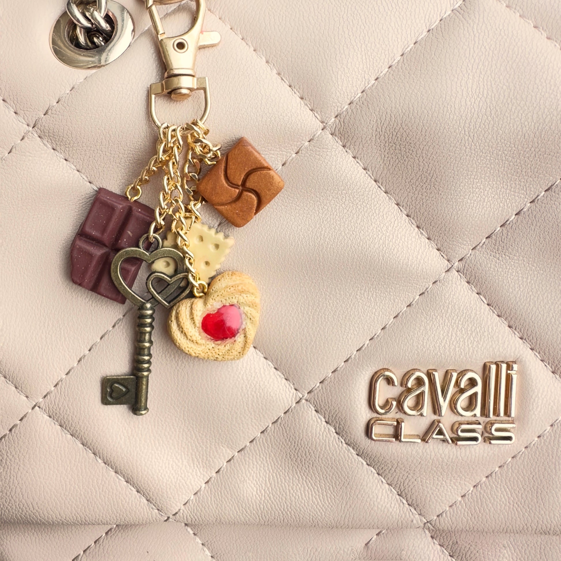 Saldumu piekariņš ar ērtu āķīti, kam zelta krāsas ķēdītē pievienots: biskvīts, šokolādes gabaliņš, karamele, veclaicīga atslēga un sirsniņveida cepums, stilistiski vienāds ar cepumu auskariem.
