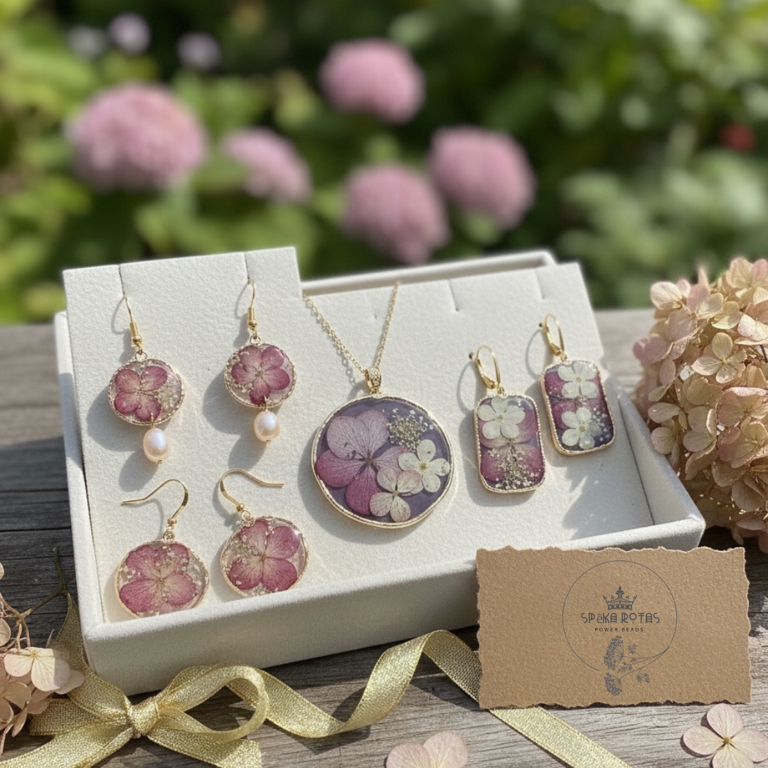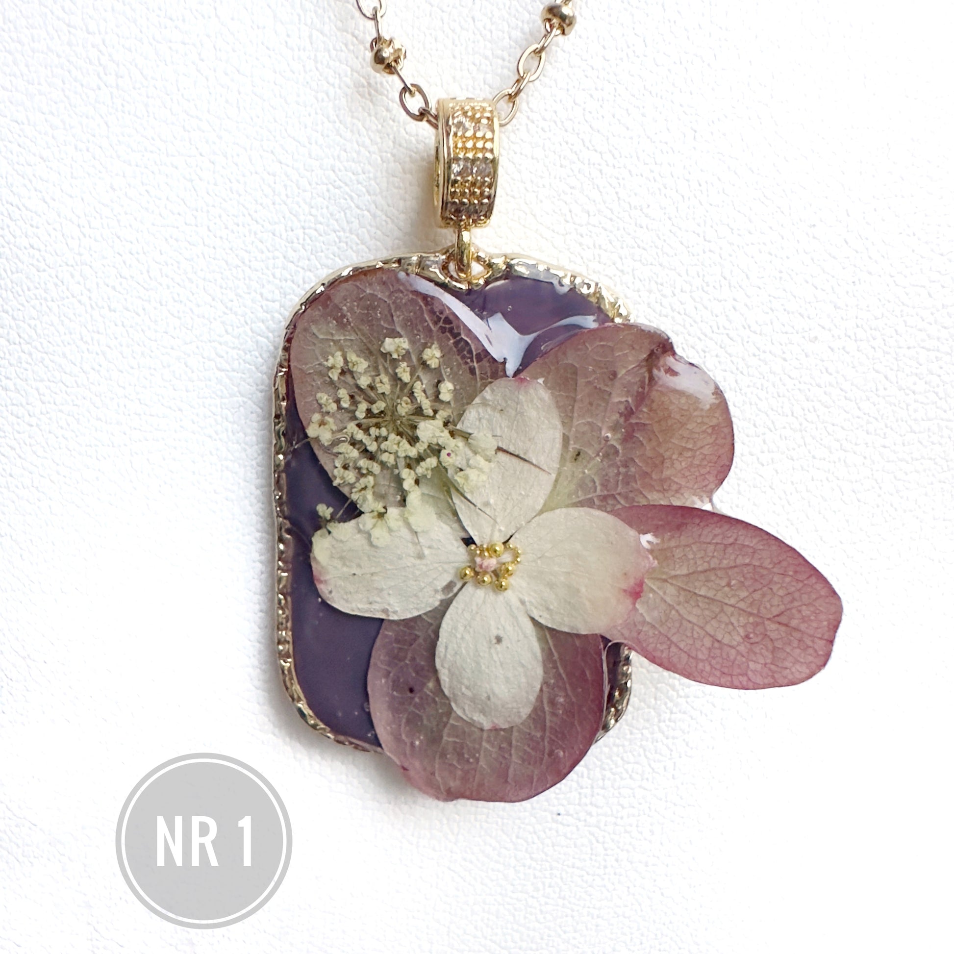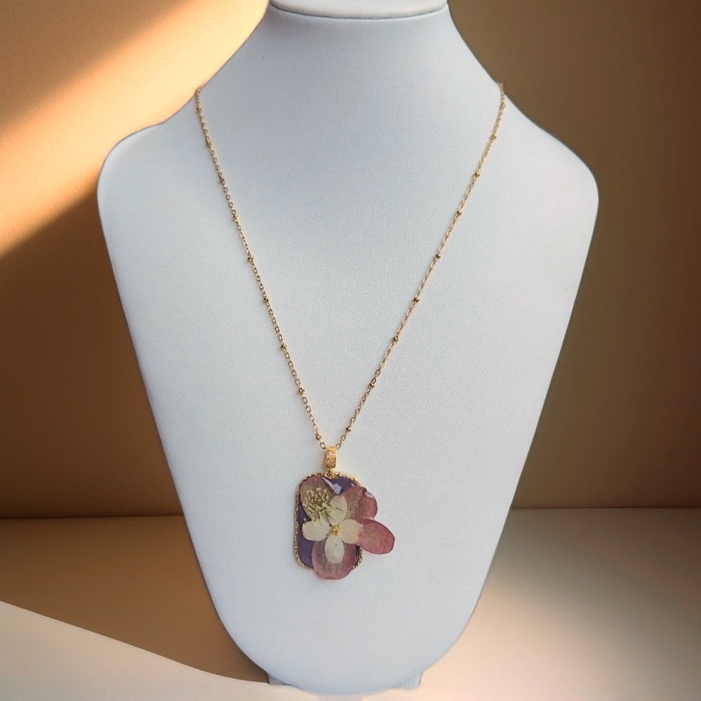 Kuloniņš izgatavots no hortenziju ziediņiem, ietvars zelta krāsas misiņš, ķēdīte 50cm no nerūsējošā tērauda.