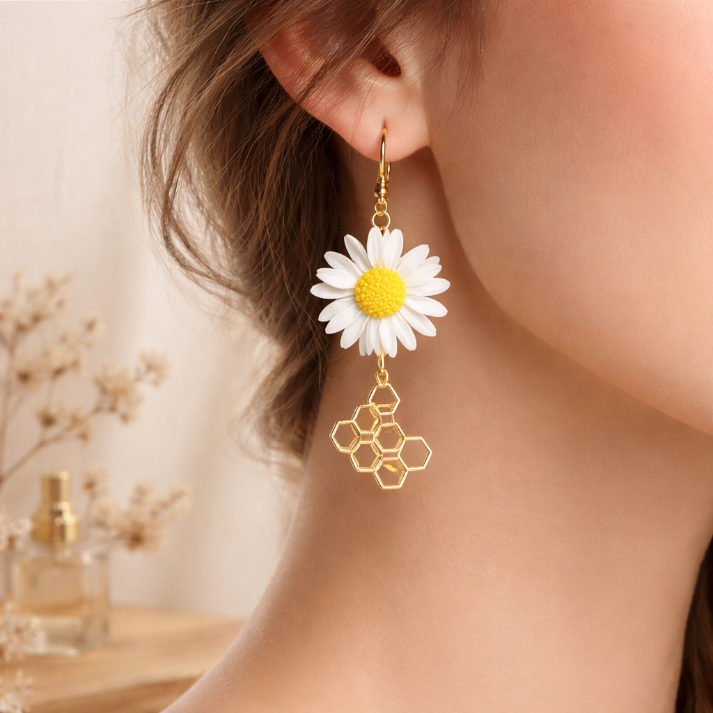 Šie margrietiņu auskari ar šūnveida motīvu ir iedvesmoti no vasaras viegluma, saules siltuma un dabas sakārtotās harmonijas. Balto margrietiņu ziedi ar izteiksmīgu dzeltenu viduciņu piešķir rotām svaigumu un gaišumu, savukārt zeltītā šūnveida detaļa atsaucas uz bišu stropu ģeometriju un dabas perfekto struktūru. Šī kombinācija rada līdzsvaru starp rotaļīgumu un eleganci.