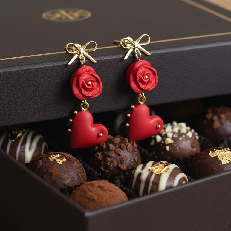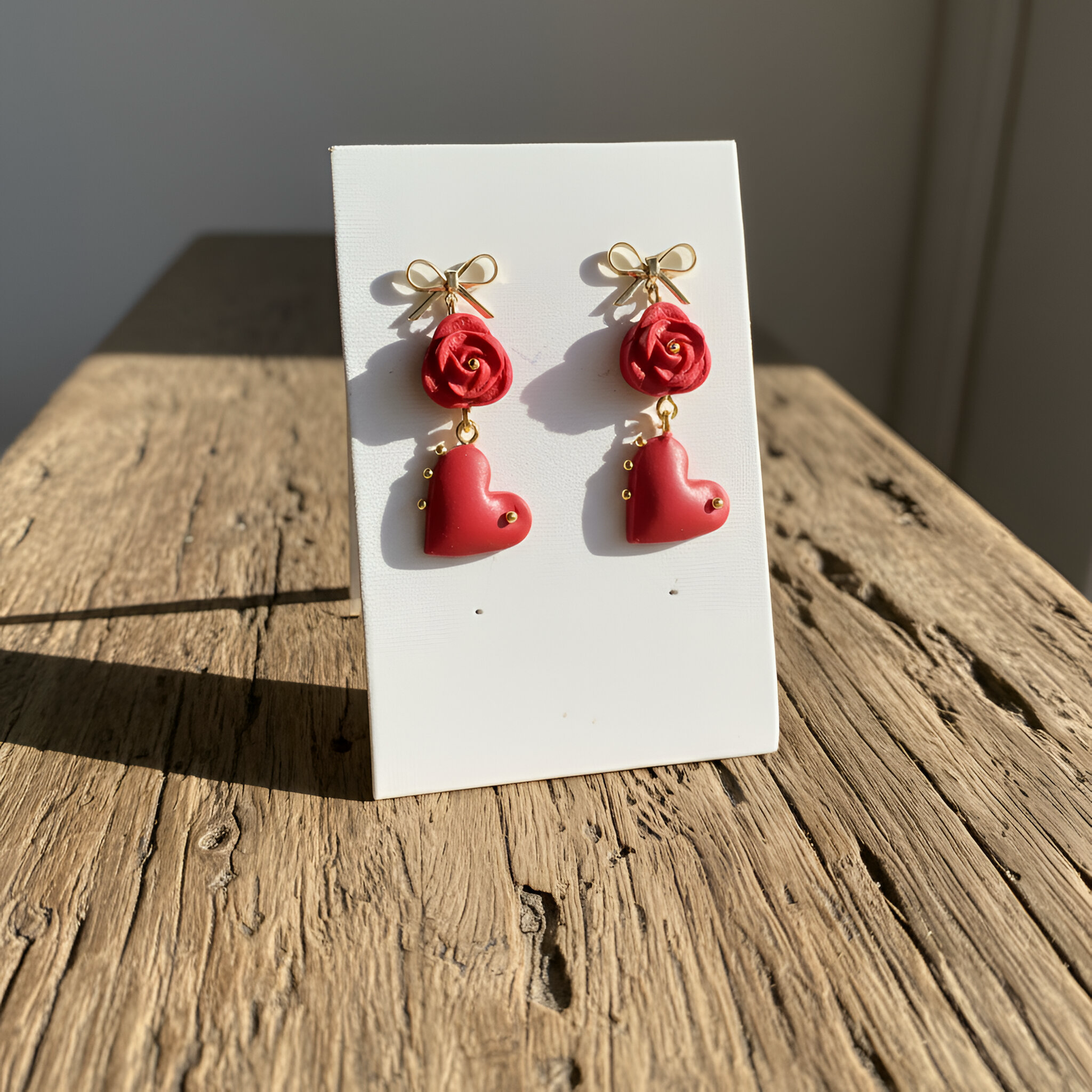 Auskara augšdaļā atrodas roku veidota sarkana roze no polimērmāla, kas piešķir rotai dzīvīgumu un amatniecisku raksturu. Zem rozes brīvi kustībā piekārta sirds formas detaļa, papildināta ar smalkiem zelta krāsas lodīšu akcentiem, kas piešķir dizainam elegantu noslēgumu.