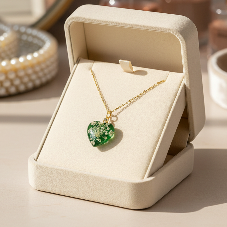 Kuloniņš izgtavots no epoksīta un kaltētiem augiem. Iesaiņots baltā kastītē, gatavs dāvināšanai.