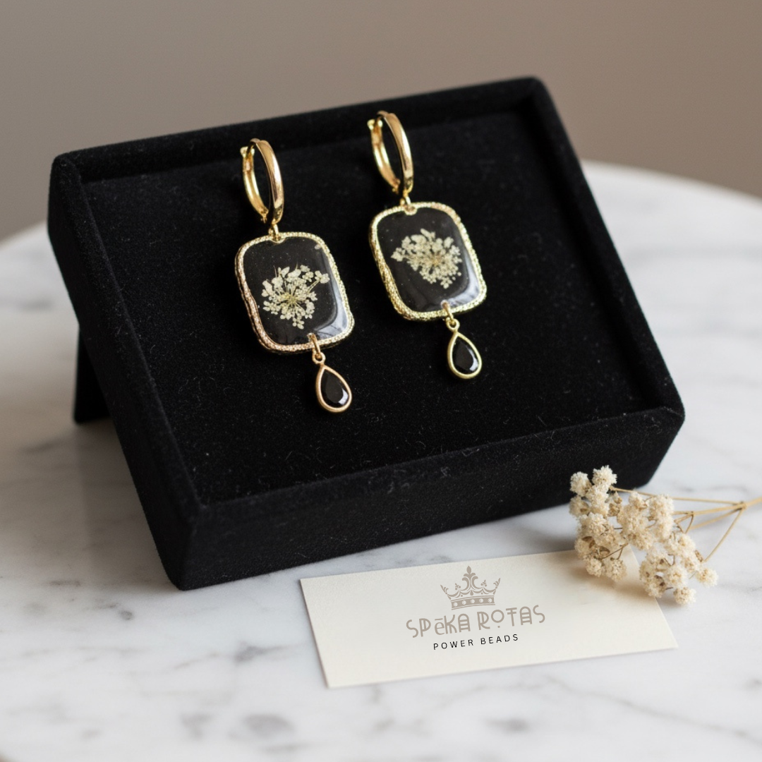 Šie elegantie, melnie auskari ir veidoti no epoksīda sveķiem, ko uzlej uz kaltētiem ziediem.