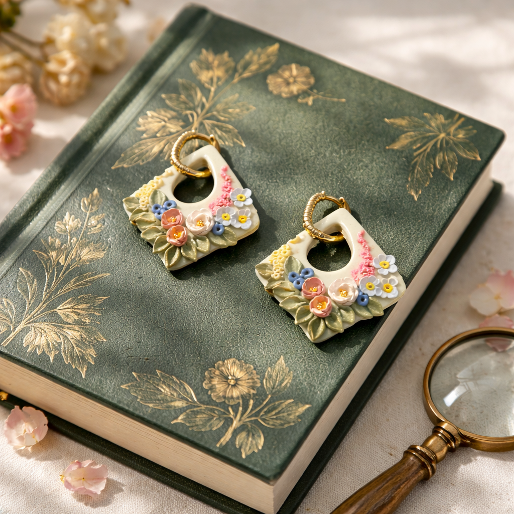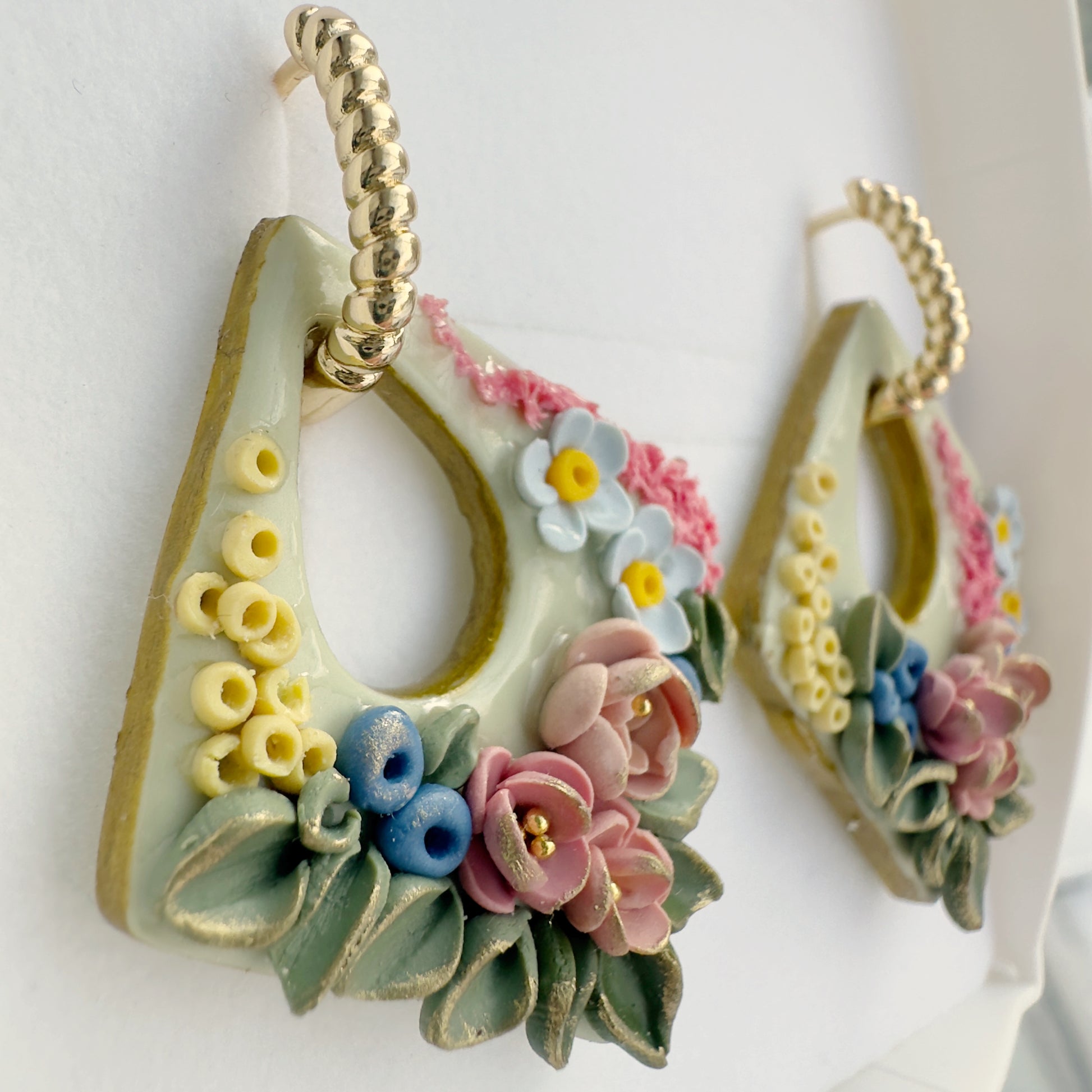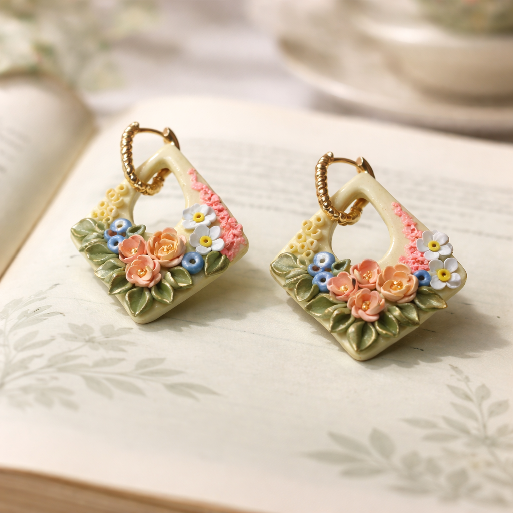 Eleganti ziedu auskari no polimērmāla – unikāls roku darbs ar telpisku rakstu un zeltītu aizdari, iedvesmots no antīkā porcelāna mākslas. Māksla, kas radīta, lai izceltu Tavu personību.