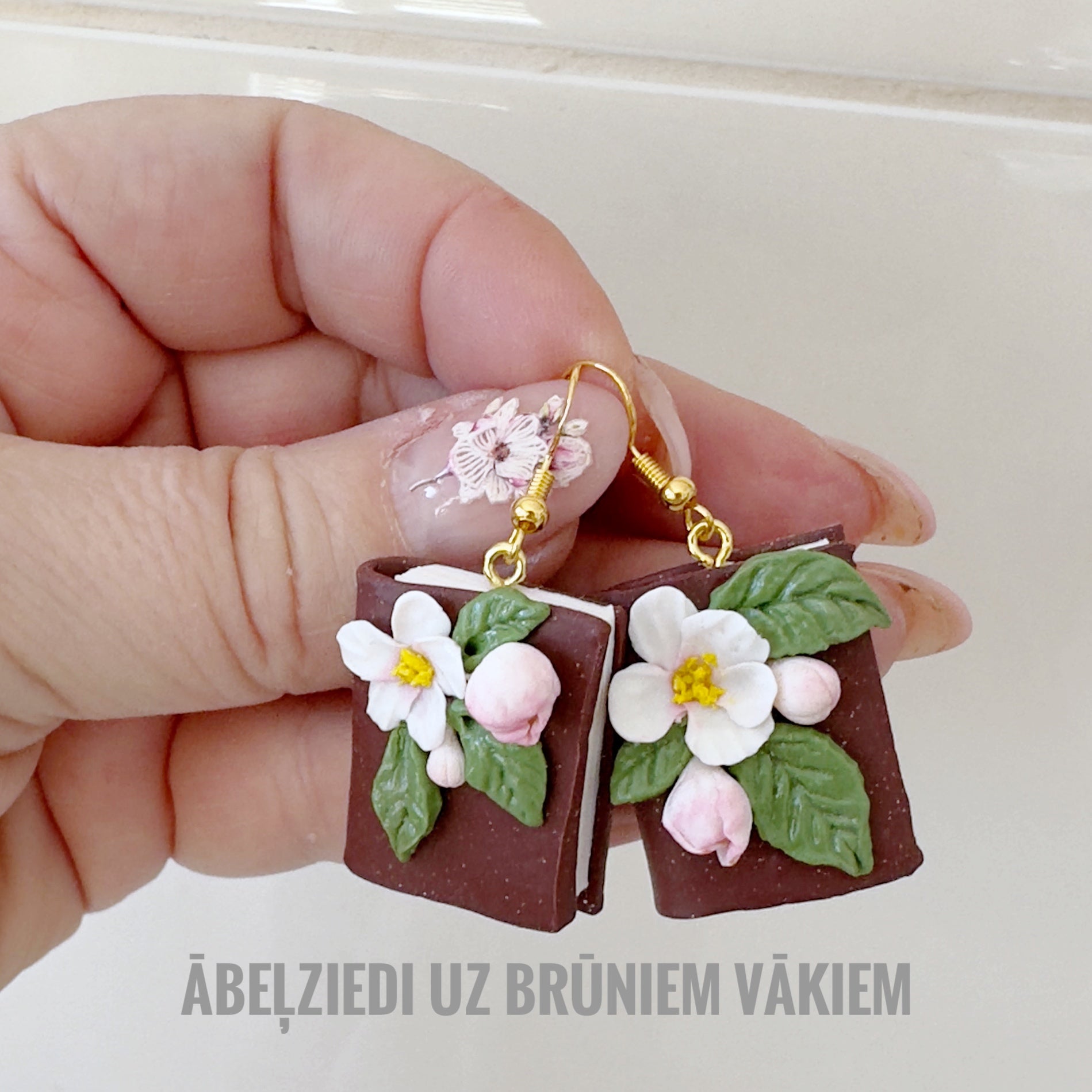 Ābeļziedu auskari uz brūna fona ar nelieliem spīdumiņiem ir viegli, ērti un eleganti ar sentimentālu vērtību. Garums 5cm