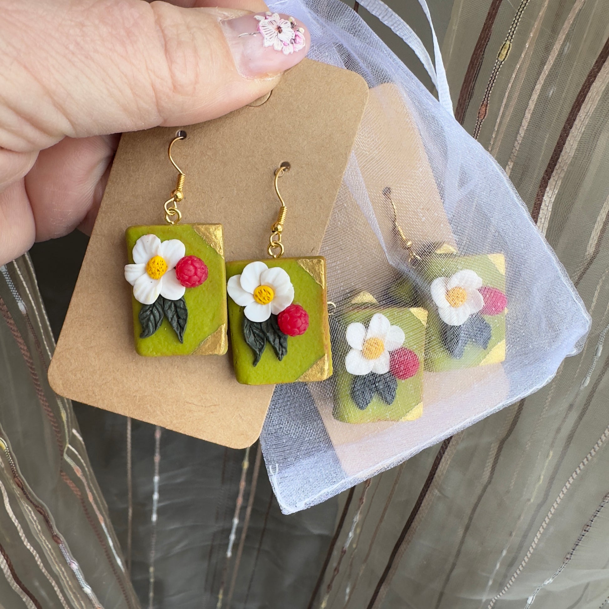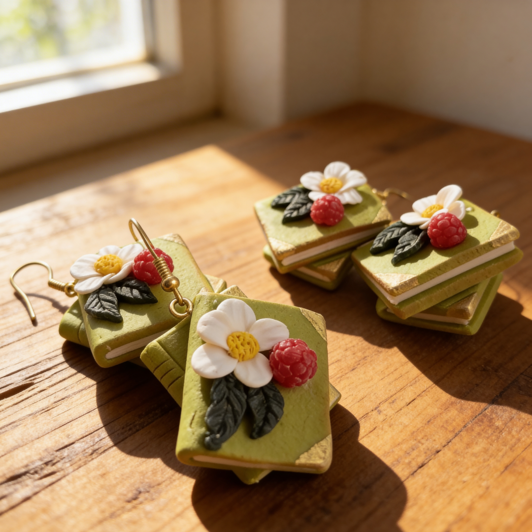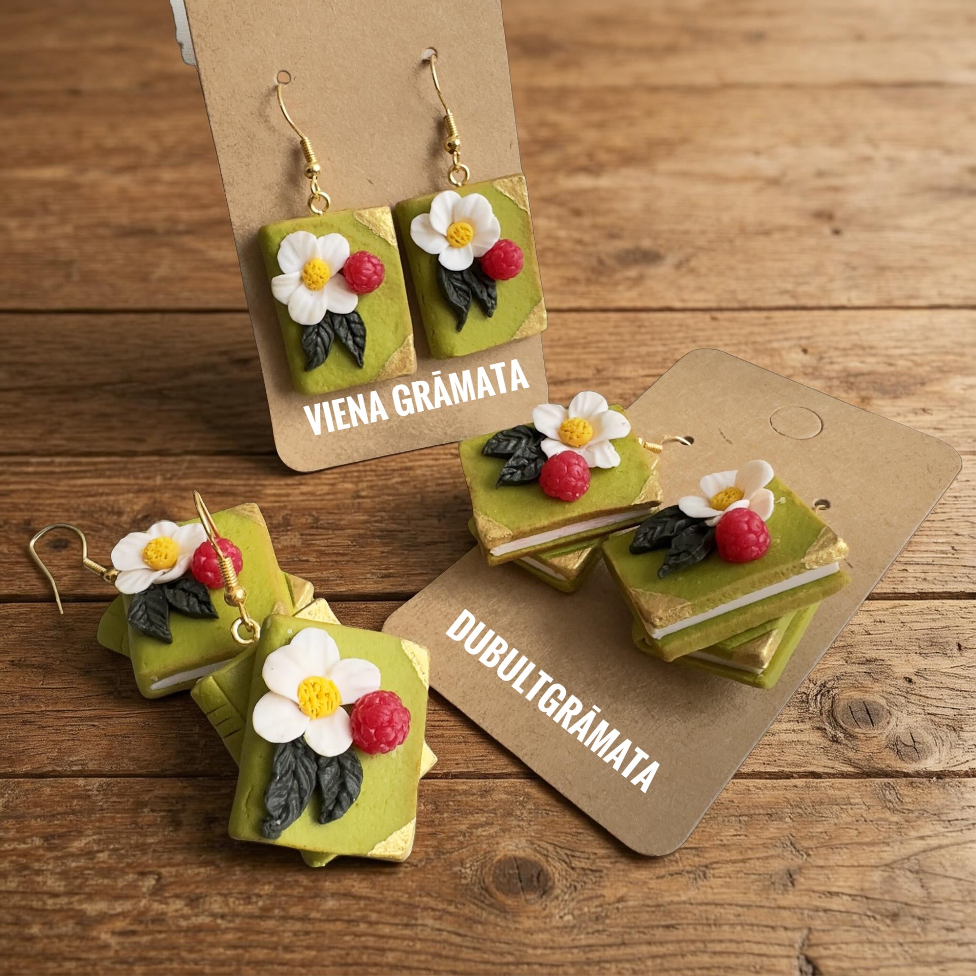 Dubultā grāmata ir romantiski auskari ar zemeņu ziedu, zemeni un mellenītēm. Katrs auskars sastāv no brūnas un zaļas grāmatas, kas ir uzliktas viena uz otras. Auskari ir smagnēji. Garums 6cm