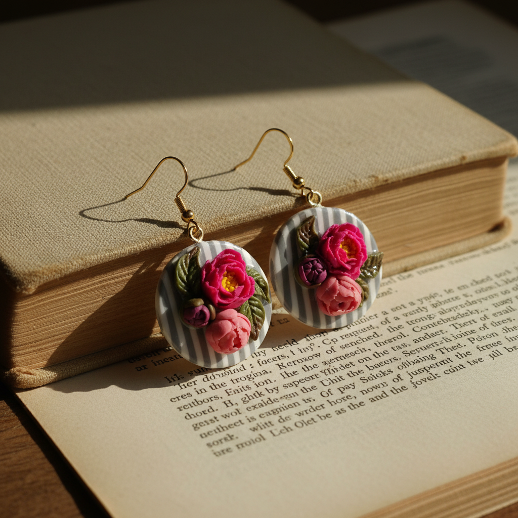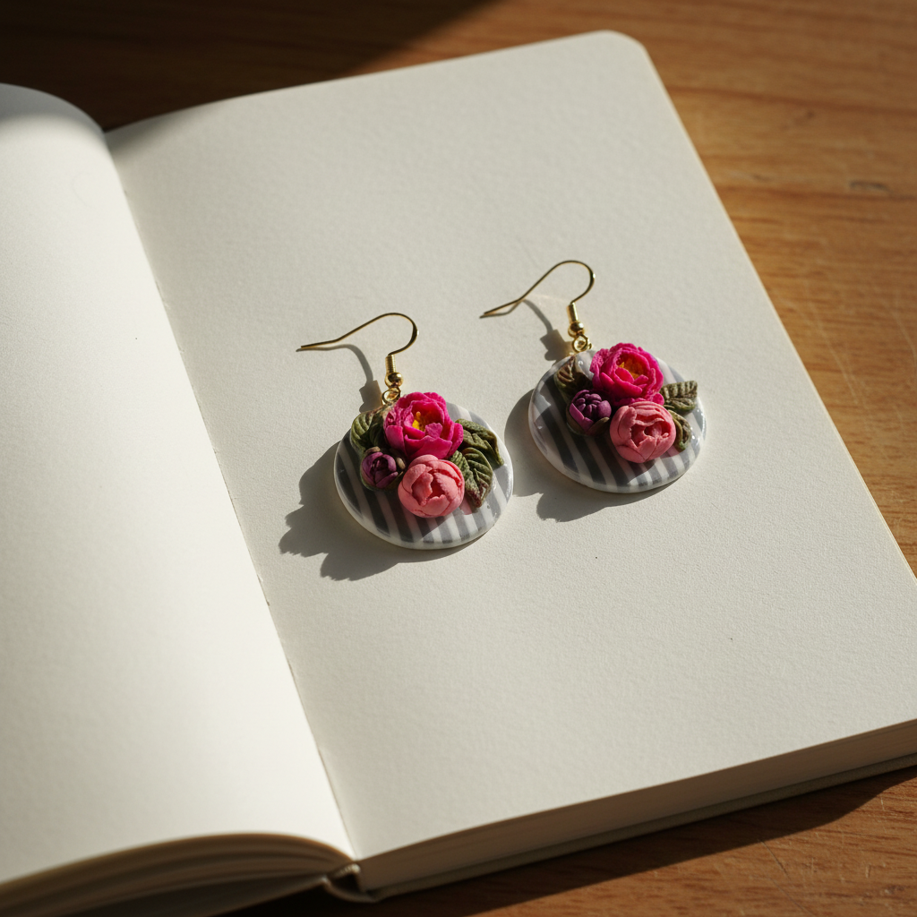 Šie apaļie ziedu auskari ir smalka ziedu skulptūra, kurā apvienojas krāsa, faktūra un rūpīgs roku darbs. Uz pelēki balta, strīpaina fona veidota bagātīga ziedu kompozīcija – katrs zieds un lapu elements ir veidots telpiski, piešķirot rotai dzīvīgumu un dziļumu.