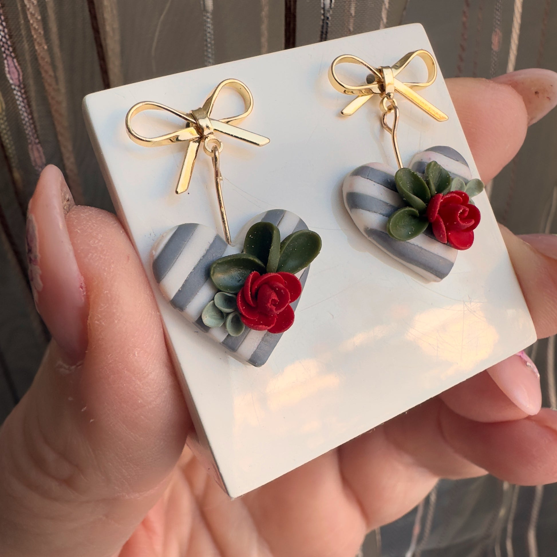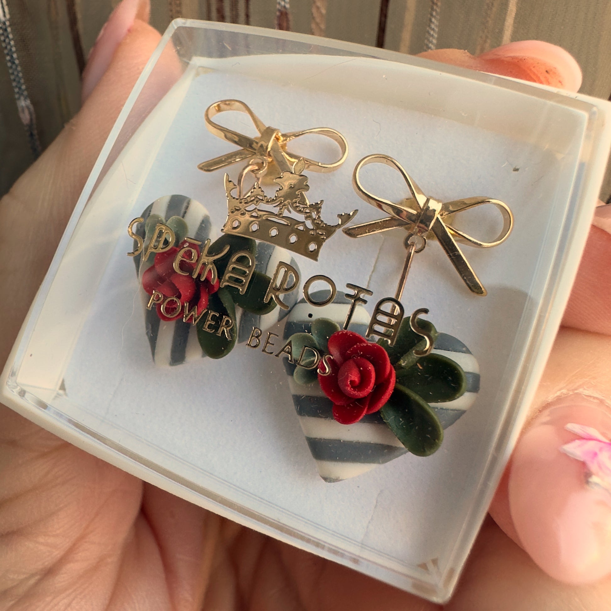 Rotu pamatā ir strīpaina sirsniņa ar sarkanu ziedu, kas piestiprināta pie bantītes veida nagliņauskaru aizdares.