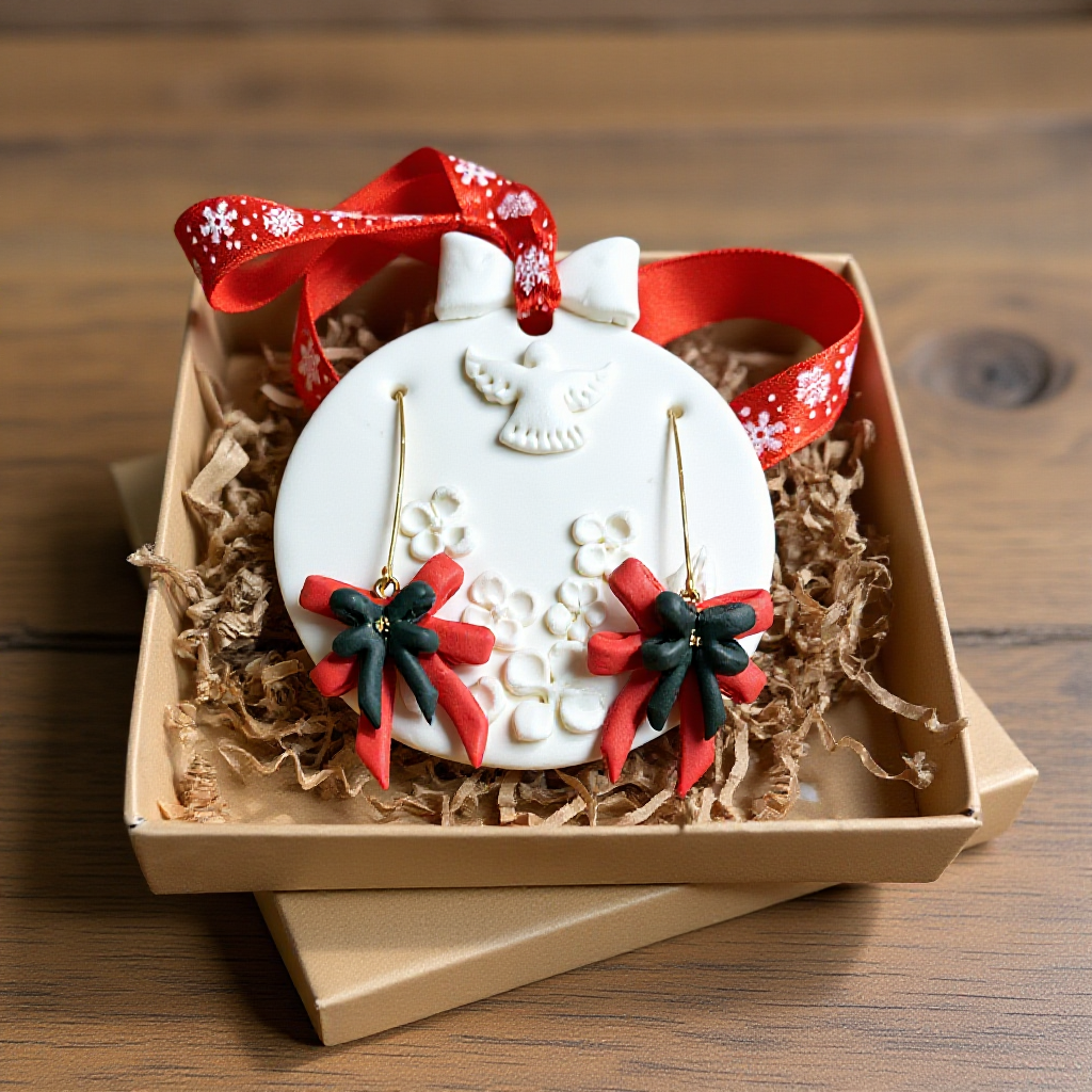 Roku darbs Ziemassvētku auskari no dubultas bantītes sarkanā un zaļā krāsā, rota - kas radīta svētku laikam un siltajām sajūtām. Auskari ir veidoti no polimērmāla – viegls, elastīgs un neplīstošs materiāls, kas nebaidās no kritieniem. Sargāt no skrāpējumiem.