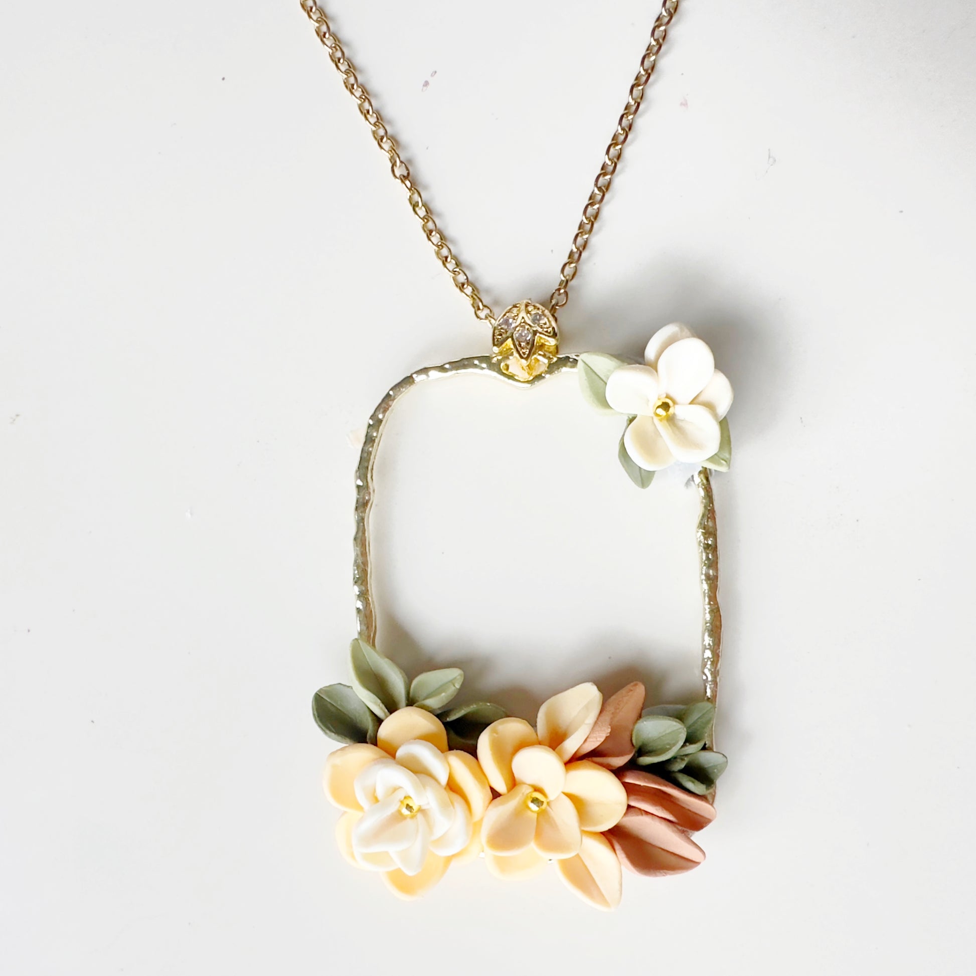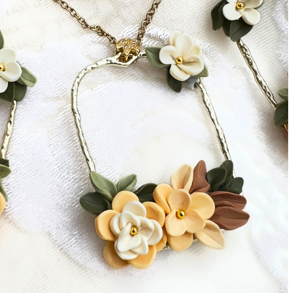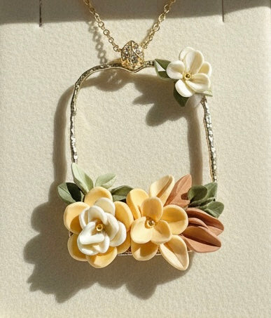 Kuloniņš izgatavots no polimērmāla ziediņiem, ietvars zelta krāsas misiņš, ķēdīte 50cm no nerūsējošā tērauda.