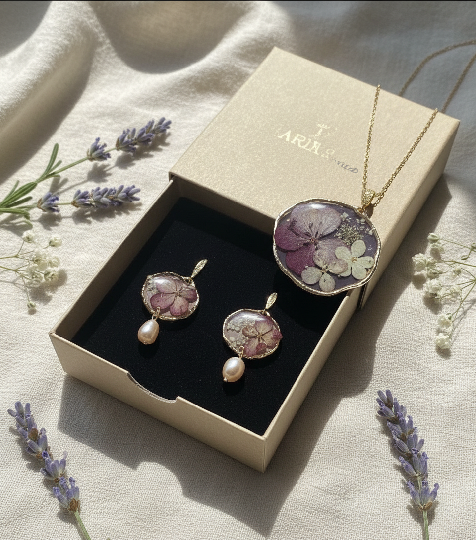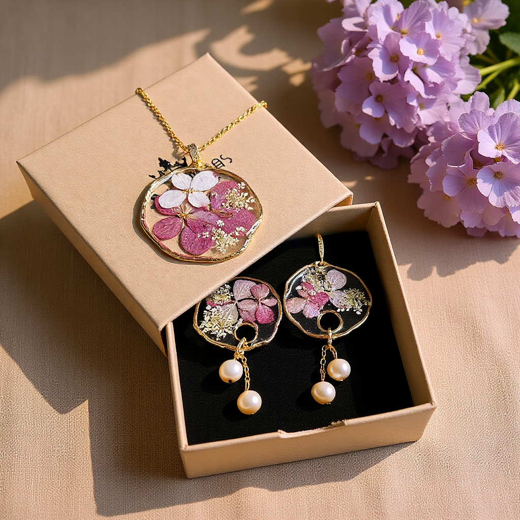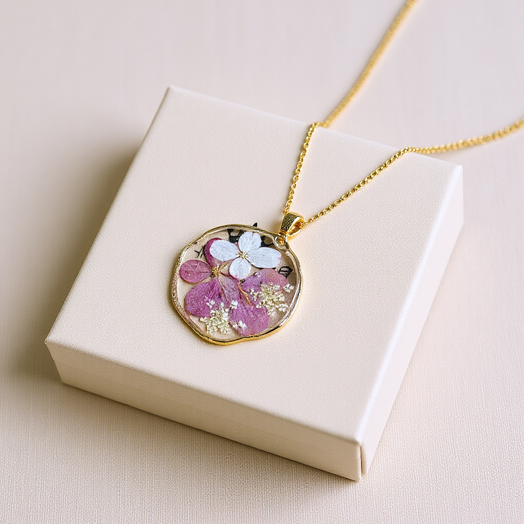 Kuloniņš izgatavots no hortenziju ziediņiem, ietvars zelta krāsas misiņš, ķēdīte 50cm no nerūsējošā tērauda.