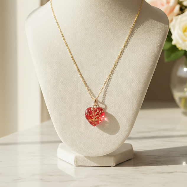Sarkanās sirds kulons ar savvaļas burkāna ziedu ir rota ar dziļu, piesātināti tumši sarkanu toni. Šī krāsa ir intensīva un eleganta, ko juvelierizstrādājumu pasaulē raksturo kā “deep crimson” - krāsa, kas vienmēr izskatās dārgi un izceļas uz ādas.