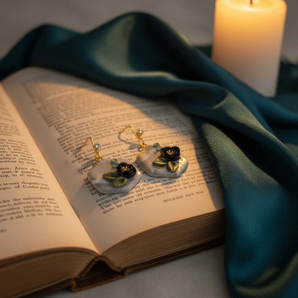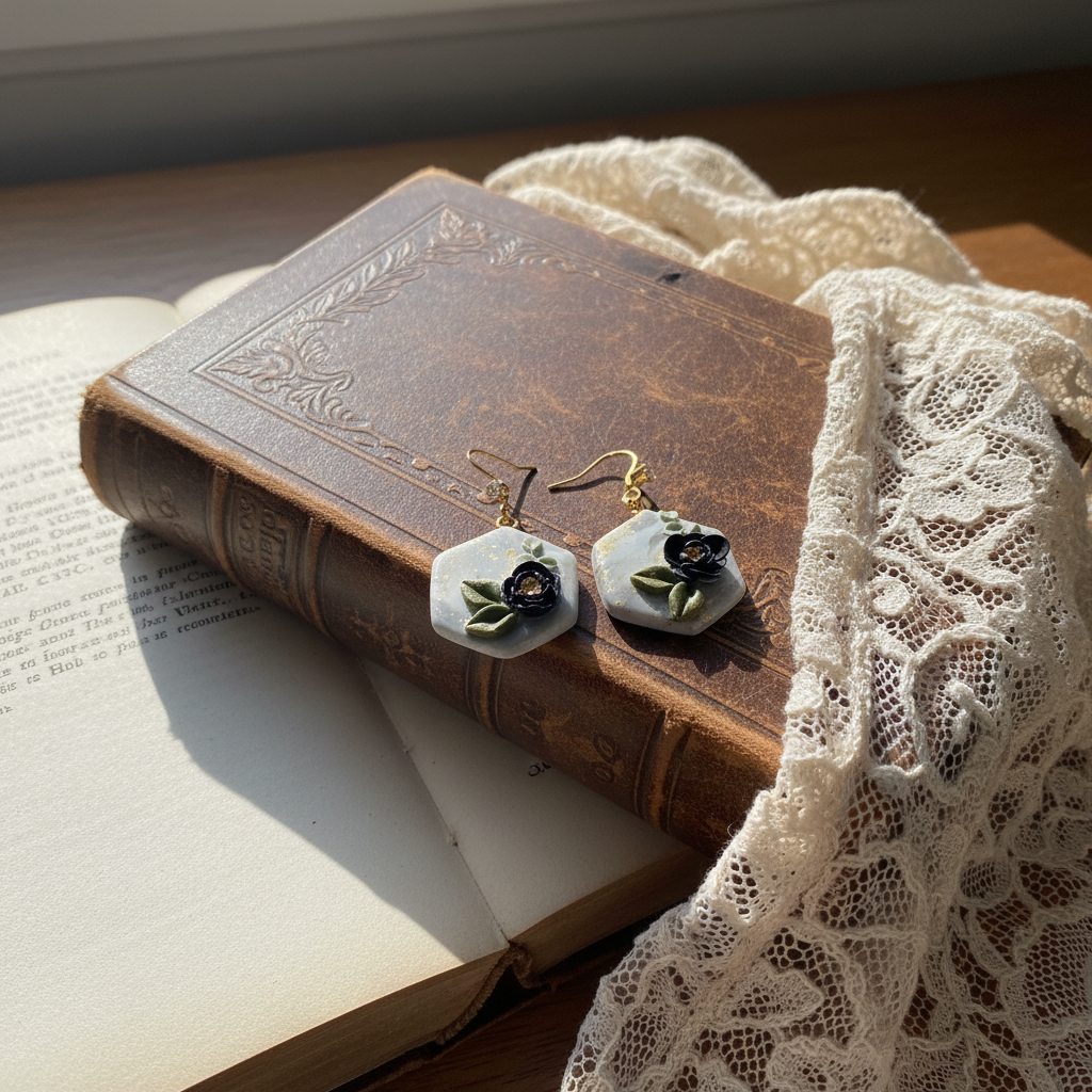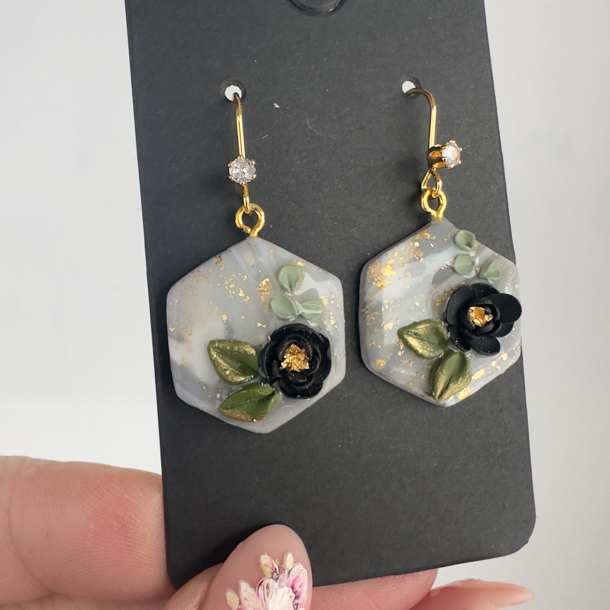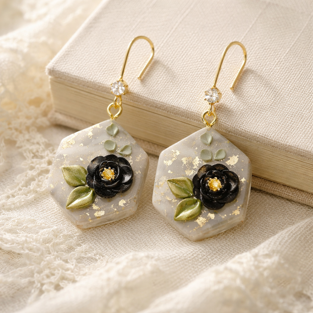 Eleganti ziedu auskari no polimērmāla un epoksīda sveķiem – unikāls roku darbs ar telpisku ziediņu.