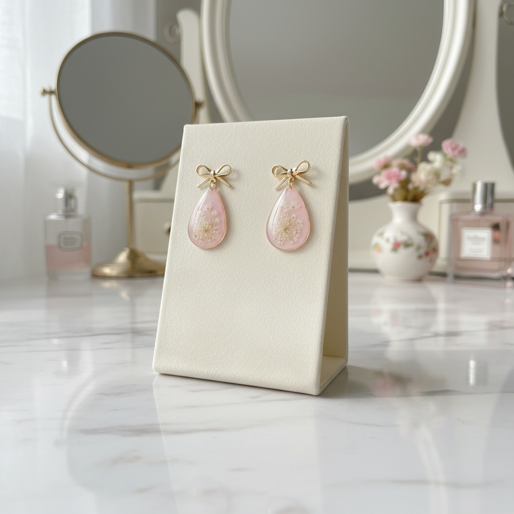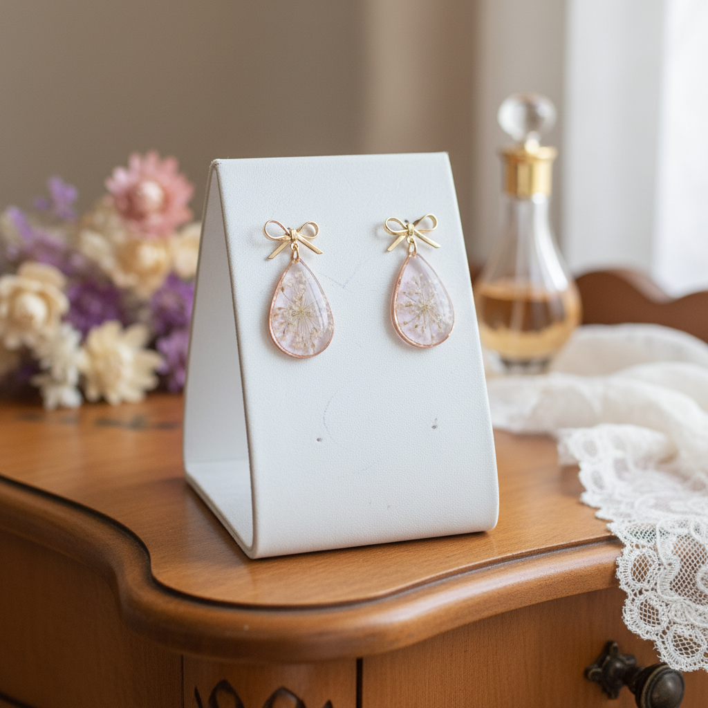 Materiāls- nerūsējošais tērauds un apzeltīts misiņš. Sauvaļas burkāna ziediņi un epoksīda sveķi. Kopējais garums 3 cm, iesaiņoti kastītē.