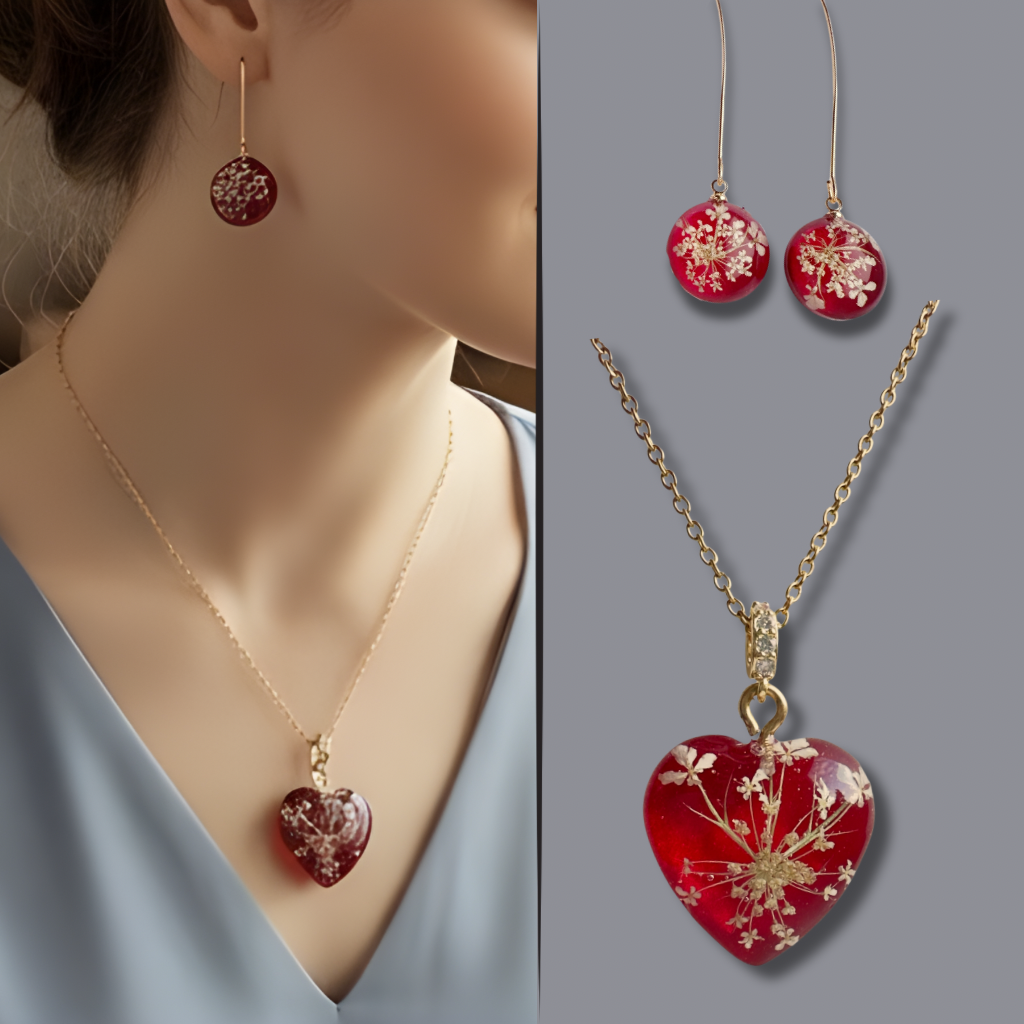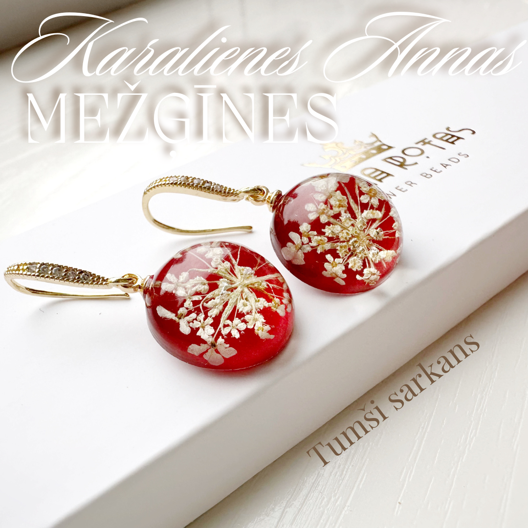 Šie auskari ir kā mazi dabas mākslas darbi – dabīgi augi iekapsulēti epoksīda sveķos, kas kā ar palielināmo stiklu, izceļ katra ziediņa skaistumu. Šeit izmantoti savvaļas burkāna ziedi, ko angliski sauc par “Queen Anne’s Lace” jeb karalienes Annas mežģīnēm.