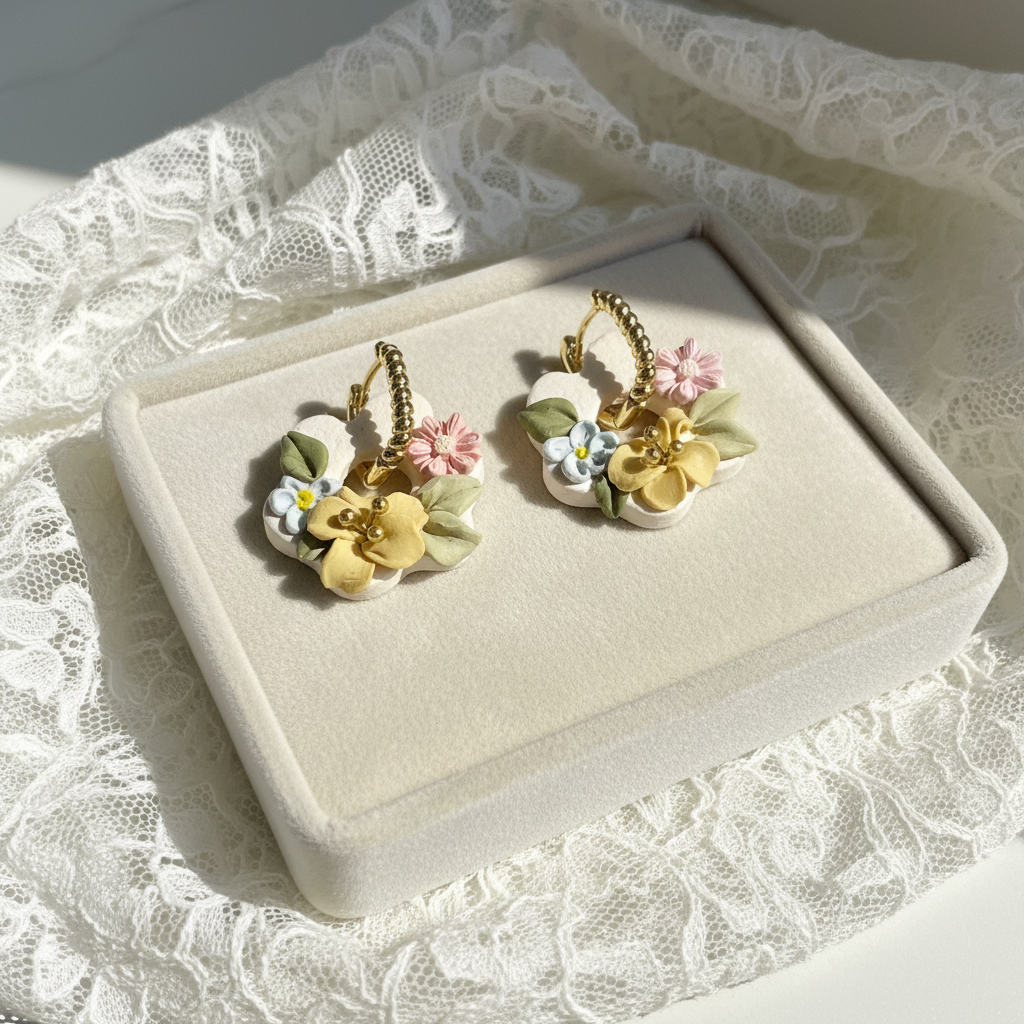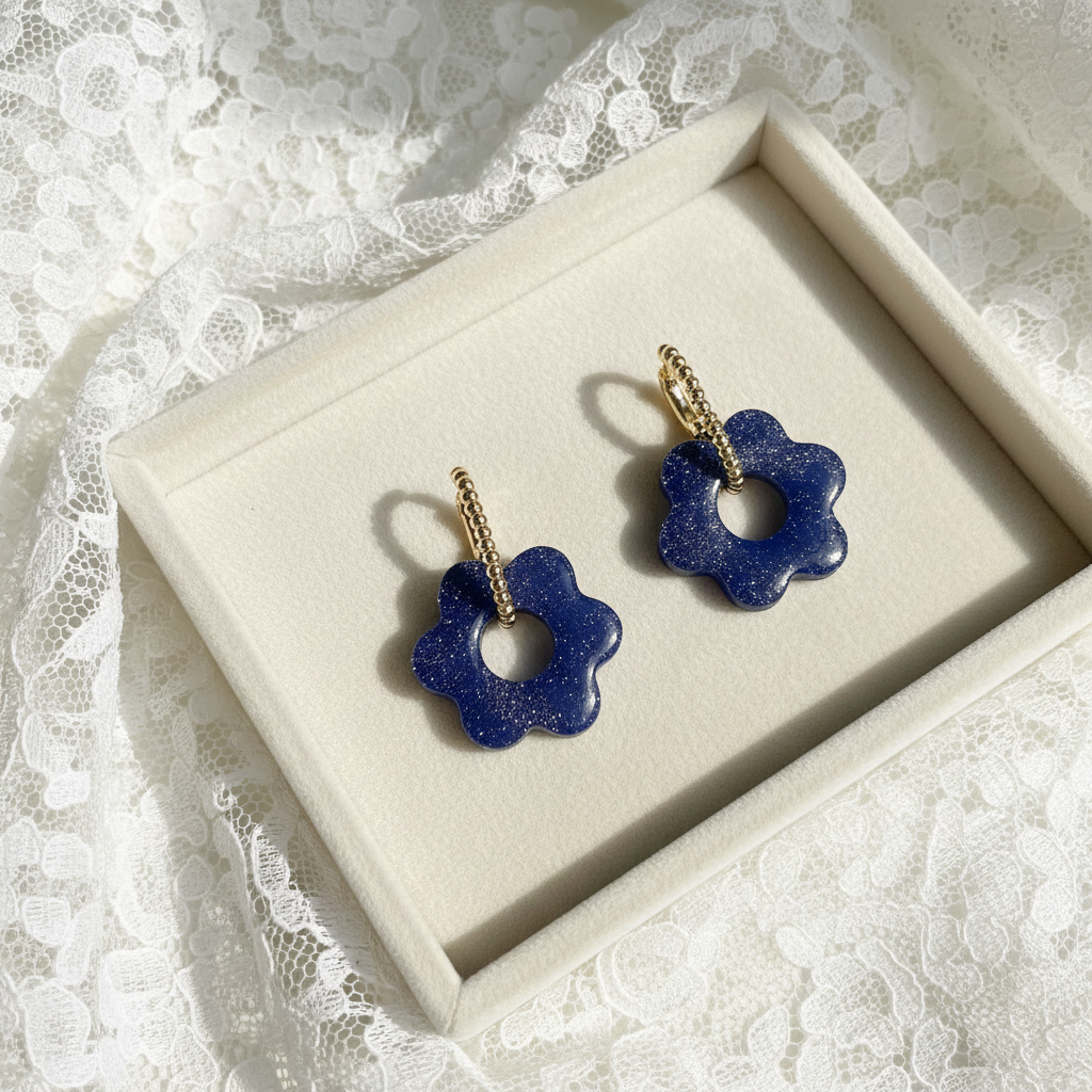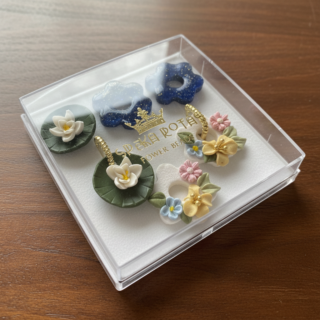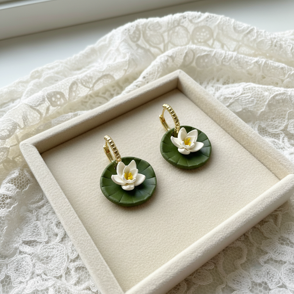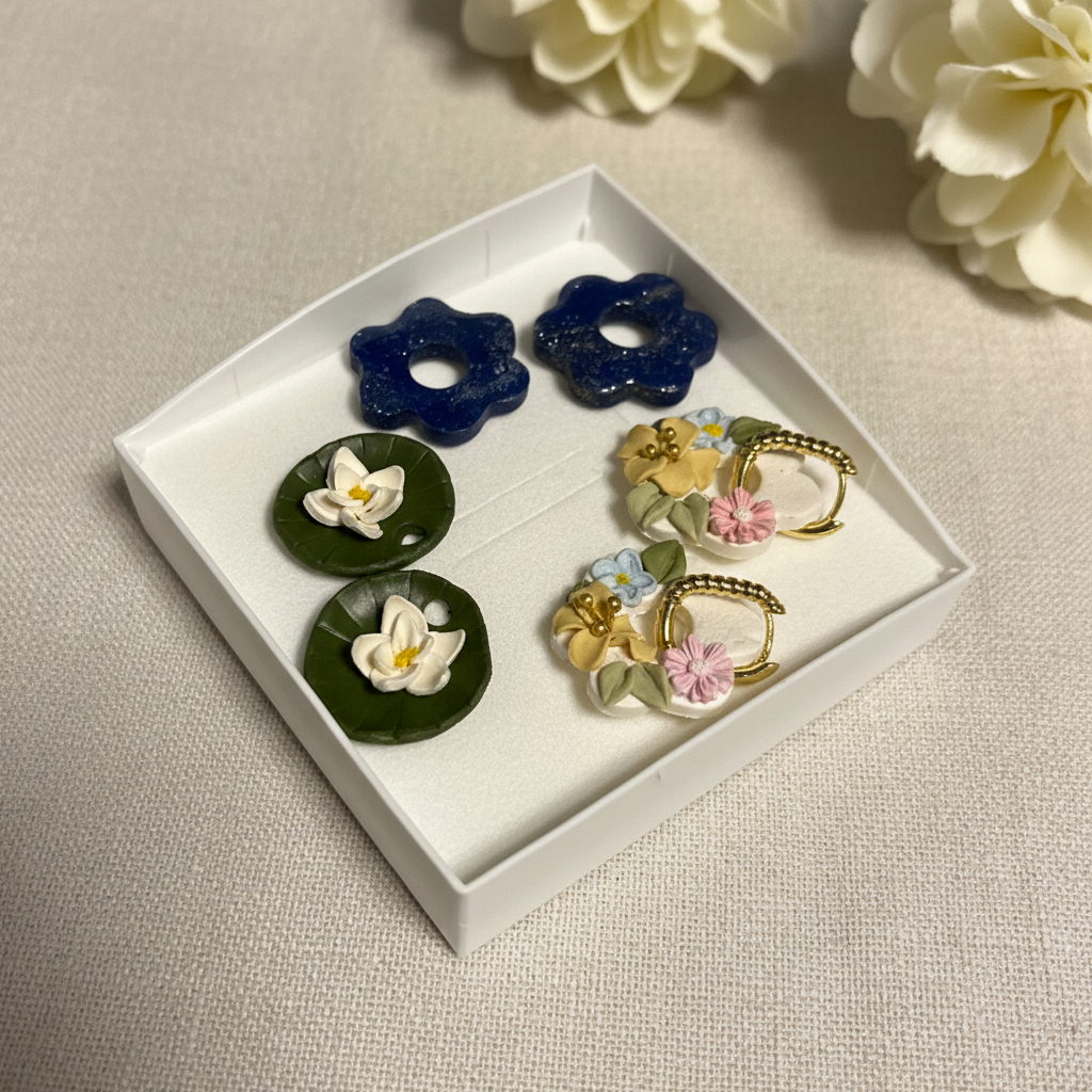 Ziedu auskari, zvaigžņotās debesis un ūdensrozes - trīs auskaru komplekts ar vienu aizdari, vienā kastītē . Katra detaļa ir rūpīgs roku darbs – polimērmasa veidota kā smalka miniskulptūra, tāpēc katrs pāris ir nedaudz unikāls. Auskari ir viegli, ērti un piemēroti ikdienai, svētku vakariem vai dāvanai sievietei, kura mīl ziedu rotas un smalku estētiku.