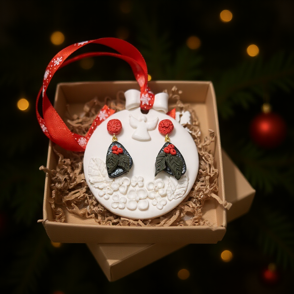Komplektā ietilpst arī Ziemassvētku eglīšu mantiņa–paliknītis, uz kura auskari ir nostiprināti. Paliknītis izgatavots no ultraviegla polimērmāla, un to var atkārtoti izmantot kā rotājumu jūsu eglītē arī turpmākajos gados.