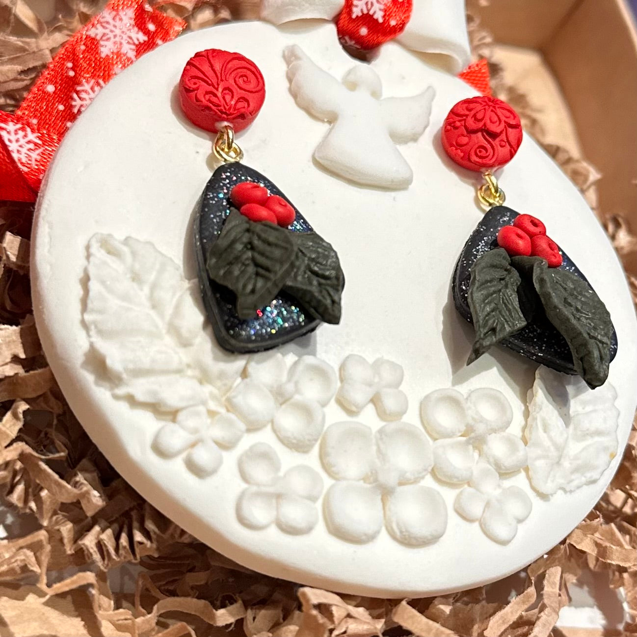 Roku darbs Ziemassvētku auskari trīs sarkanas odziņas, divas zaļas lapiņas uz melna spīdīga fona, rota - kas radīta svētku laikam un siltajām sajūtām. Auskari ir veidoti no polimērmāla – viegls, elastīgs un neplīstošs materiāls, kas nebaidās no kritieniem. Sargāt no skrāpējumiem.